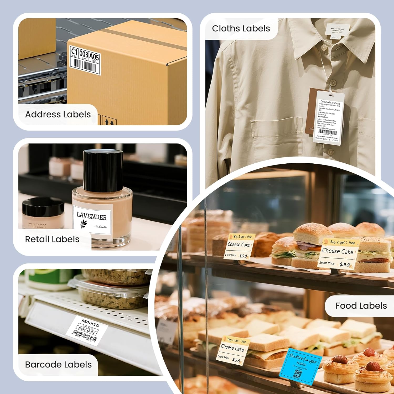 - Widely Application: The CLABEL label maker machine with tape has a wide range of applications and creativity. Like small businesses: clothing, crafts, retail, jewelry, etc. Label address, barcode, qr code, price, date, ingredients, and product labeling. Ideal for a variety of labeling needs, including Christmas, Halloween, Thanksgiving, Father's Day, Mother's Day