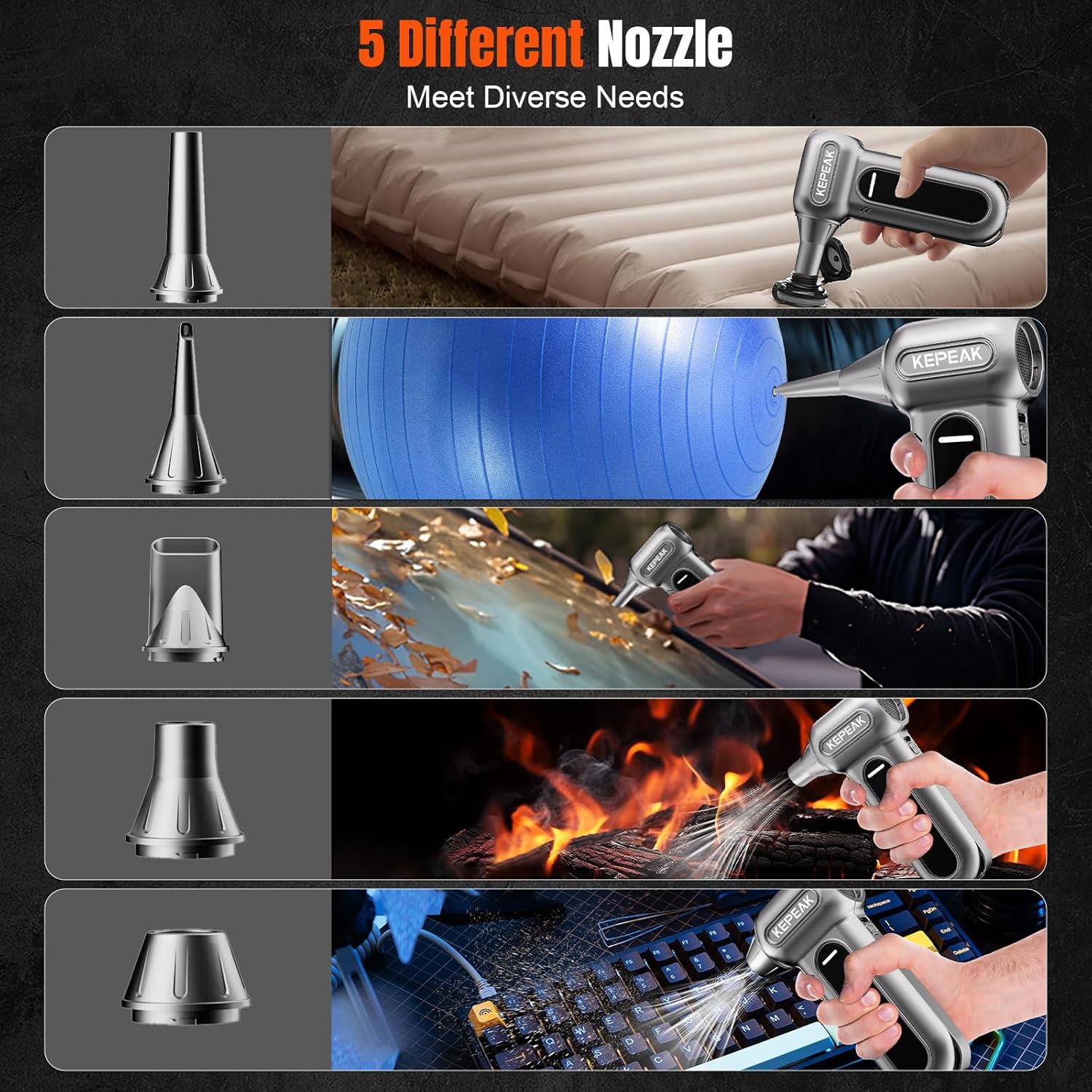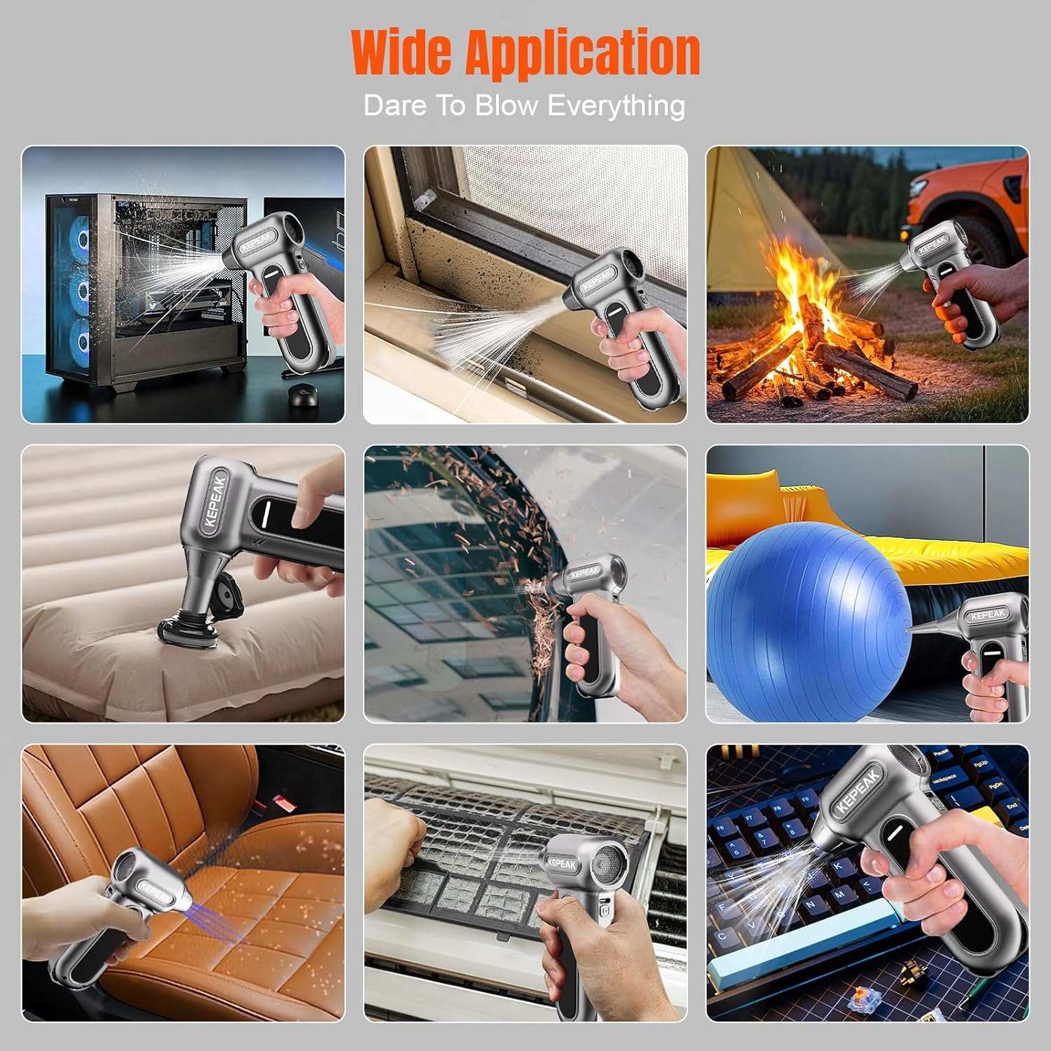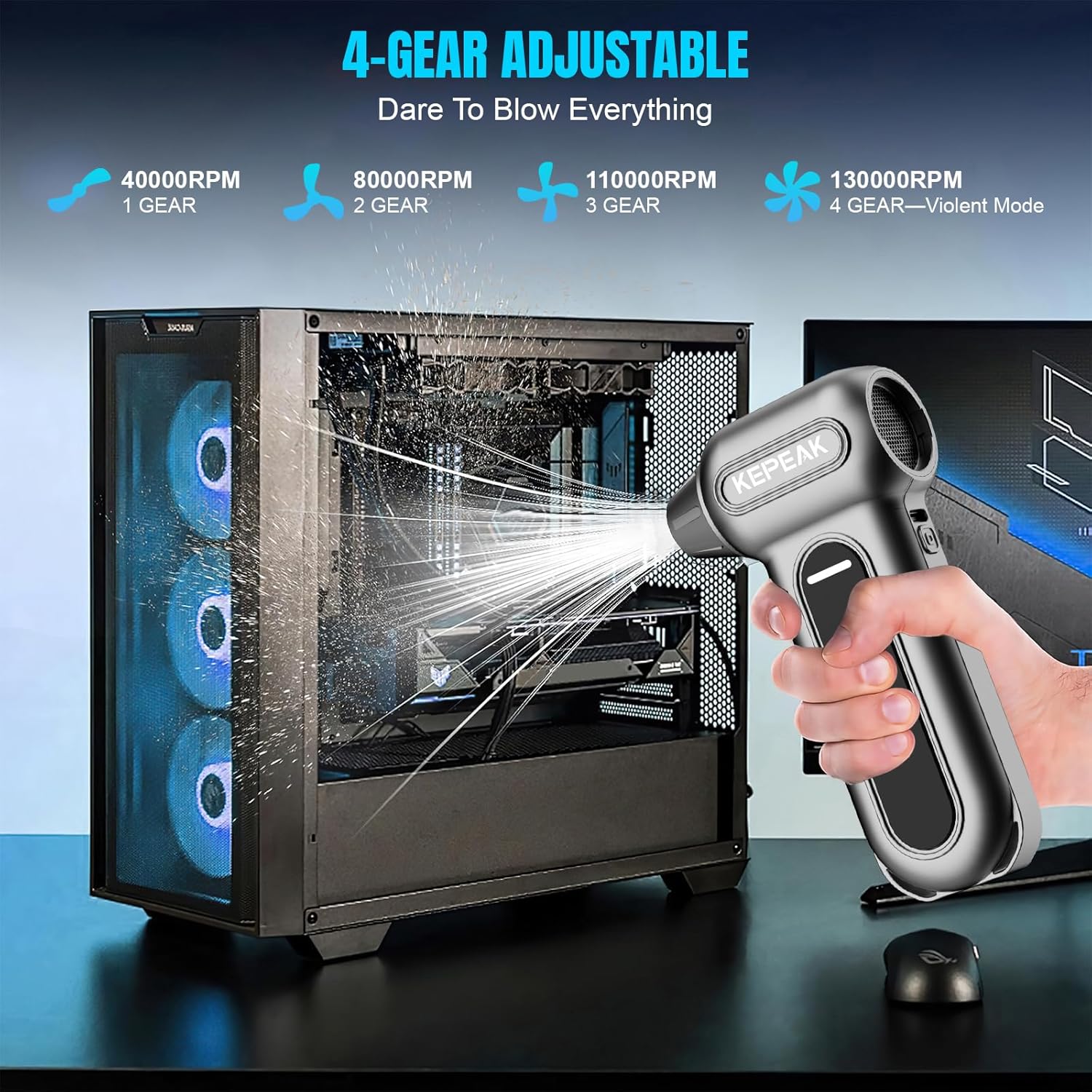 - KEPEAK Compressed Air Duster with Brushless Motor: Experience high-speed cleaning with our electric air duster, featuring a brushless motor that delivers up to 130000 RPM and 200W max power for efficient dust removal on electronics, keyboards, and PC components.
