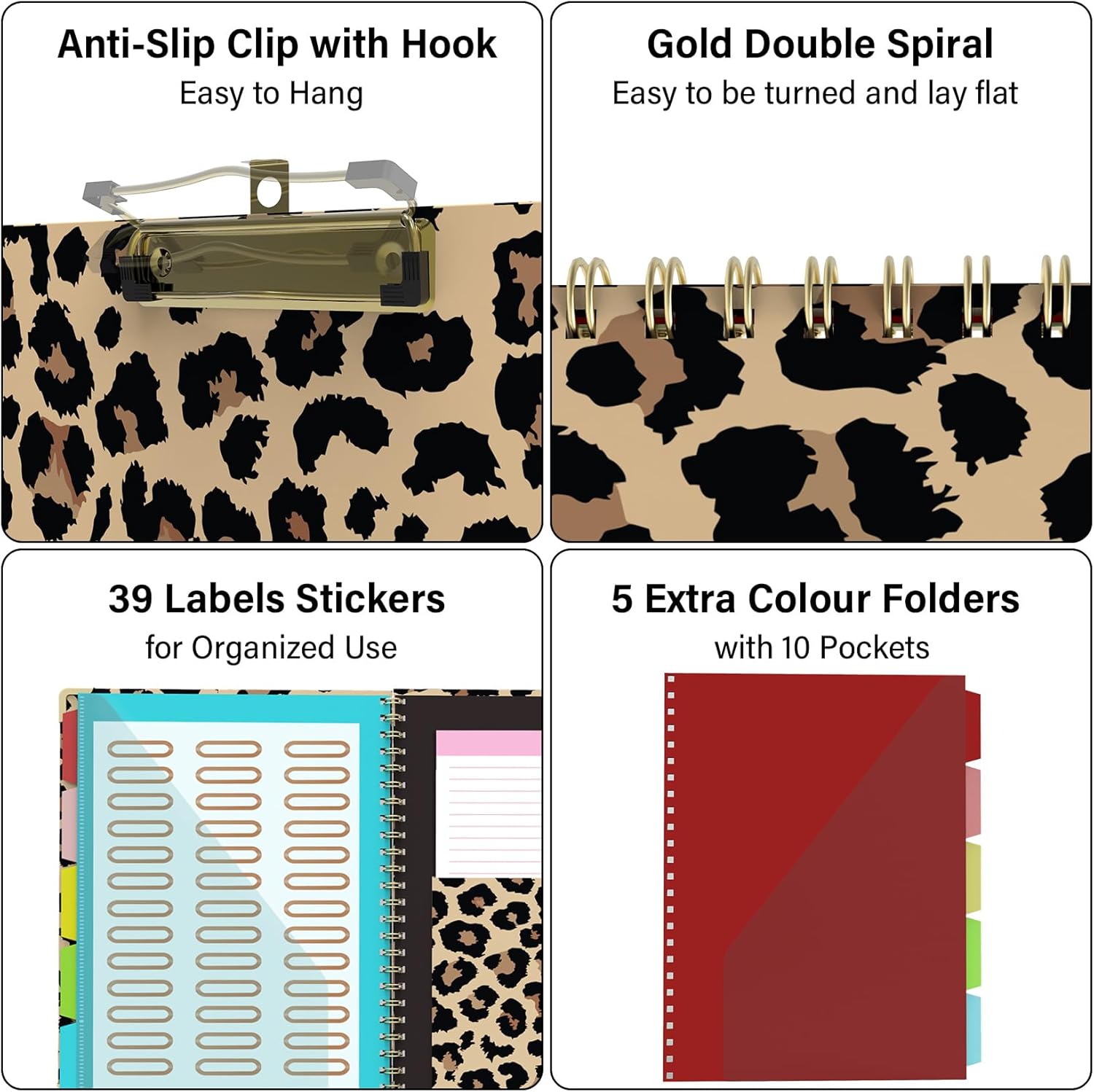 Foldable Clipboard Folio with Storage, 5 Plastic Folders with 10 Pockets,Refillable Lined Notepad (11" x 8.5"), Hardcover Project Organizer Nursing Teacher School Essentials(Cheetah Spots)