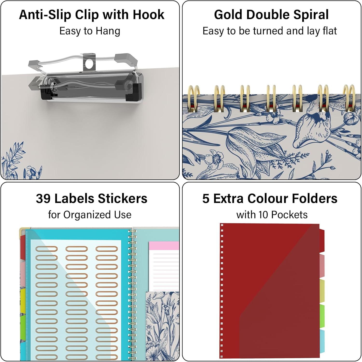 - 【Easy to Categorize】Clipboard notebook comes with 5 extra Plastic Color Folders with 10 pockets fit in all standard US letter size sheets. 39 self-adhesive file folder labels, making it easy to categorize. An elastic band keeps your files securely in place and also can be used as a bookmark