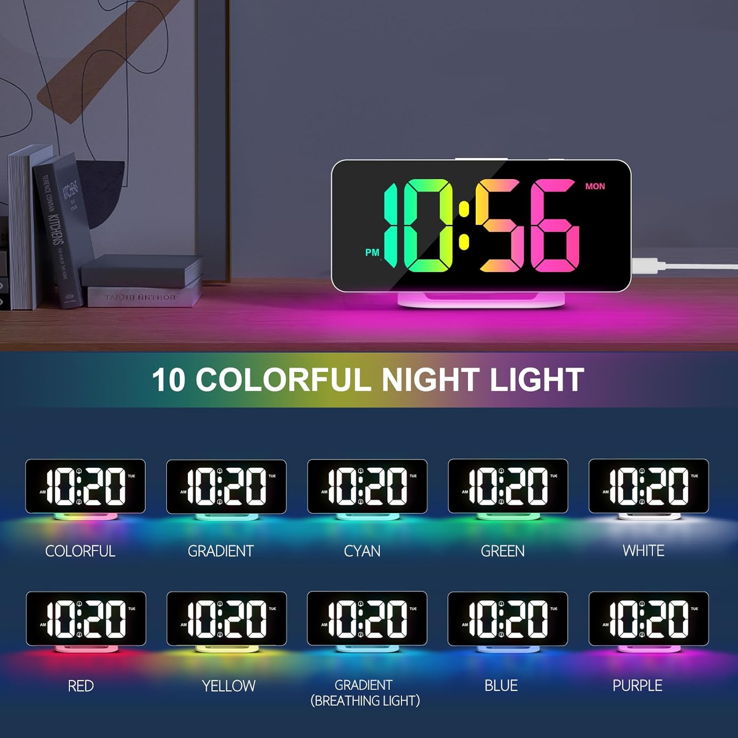 - 【Ambient Light】The bottom of the digital alarm clock for Bedroom comes with 10 different color ambient lights, giving you a warm and romantic night.