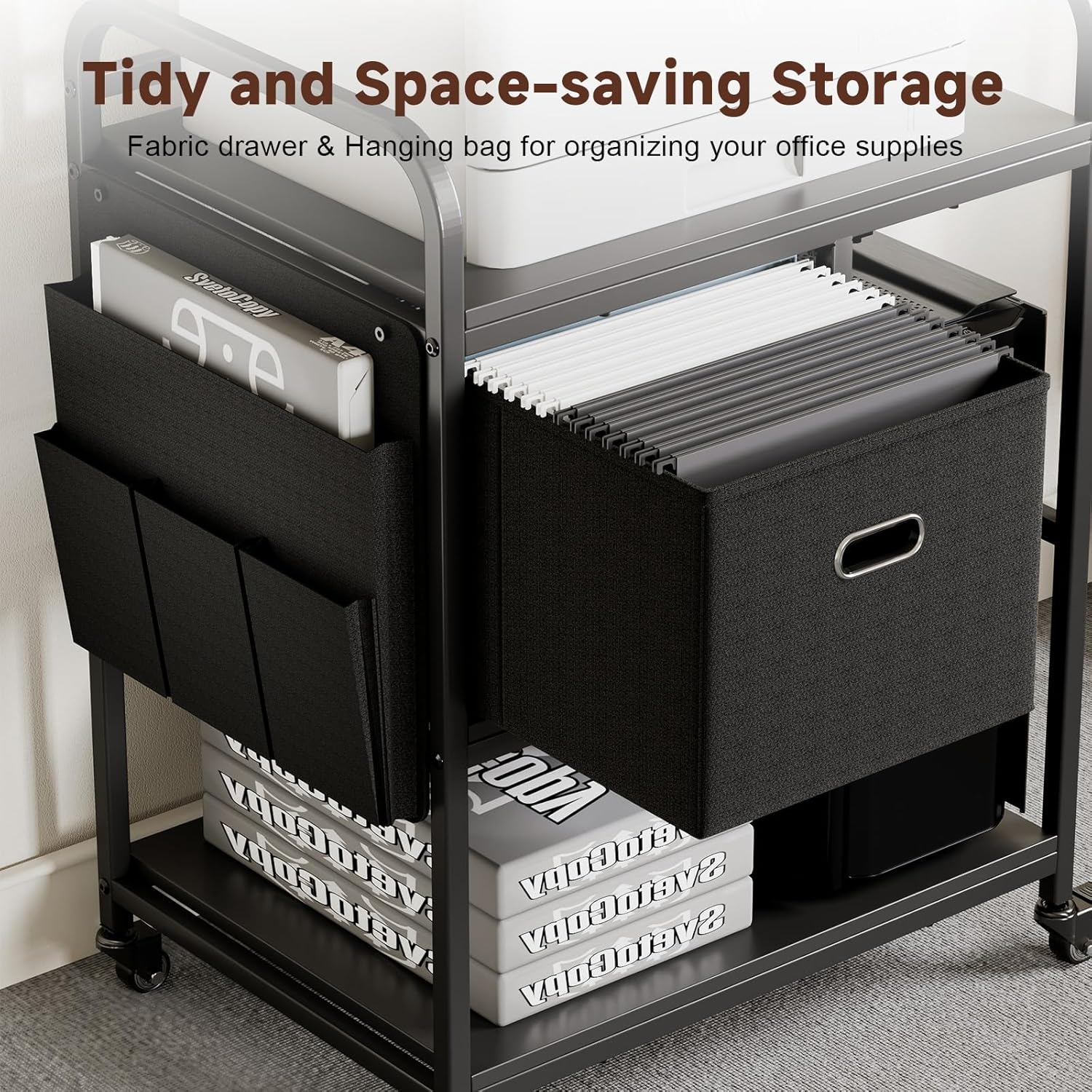 - STORAGE & MODULAR DESIGN: Designed with a built-in drawer and side hanging organizer, this printer table offers extra storage options, and wire frames for hanging folders. The detachable components can be rearranged for front- or back-facing setups. Easily adapt the structure to fit your space and storage needs.