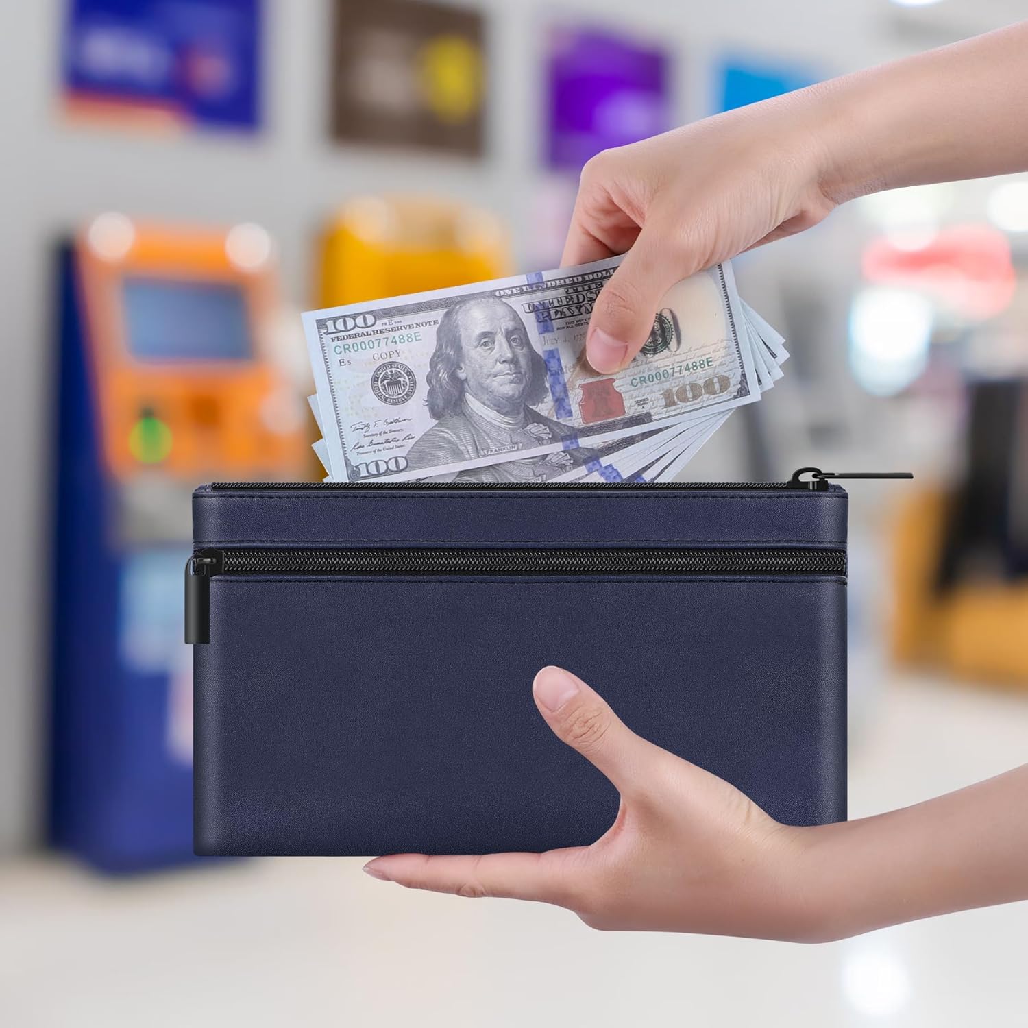 HAUTOCO 2 Pack Money Bag with Zipper 11x6.1 inch Money Pouch with Lined PU Leather Bank Bag Two Pockets Utility Wallet for Cash Check Receipt Coins Cosmetics, Dark Blue