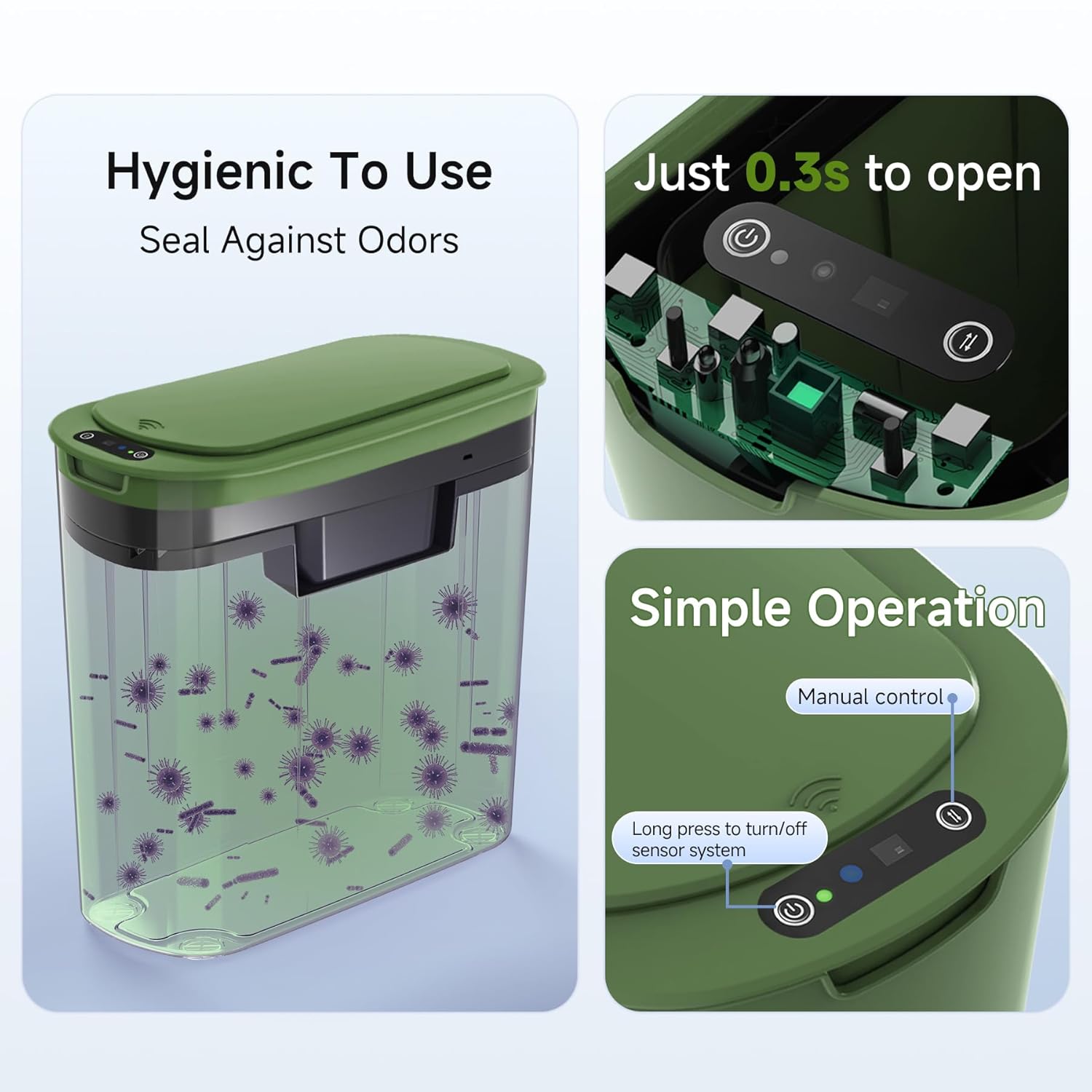 Automatic Motion Sensor Bathroom Trash Can with Lid, 2.6 Gallon Touchless Trash Bin, Smart Garbage Can Plastic Slim Wastebasket for Bedroom, Office, Dorm (Green)