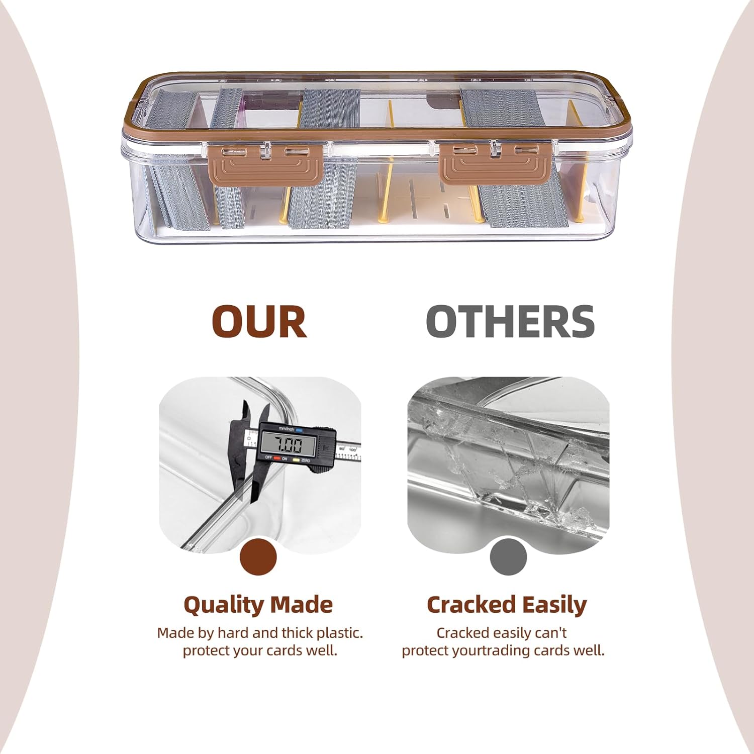 - SealingFunction: The box features a 4-clip design to prevent your card organiser from accidentally falling out. The top lid is equipped with a sealing ring, its airtight design provides excellent protection against dust and moisture, keeps the contents of the box clean and dry, protects your trading card sleeve from dust, water or scratches ensures that your trading card organiser remains in pristine condition.
