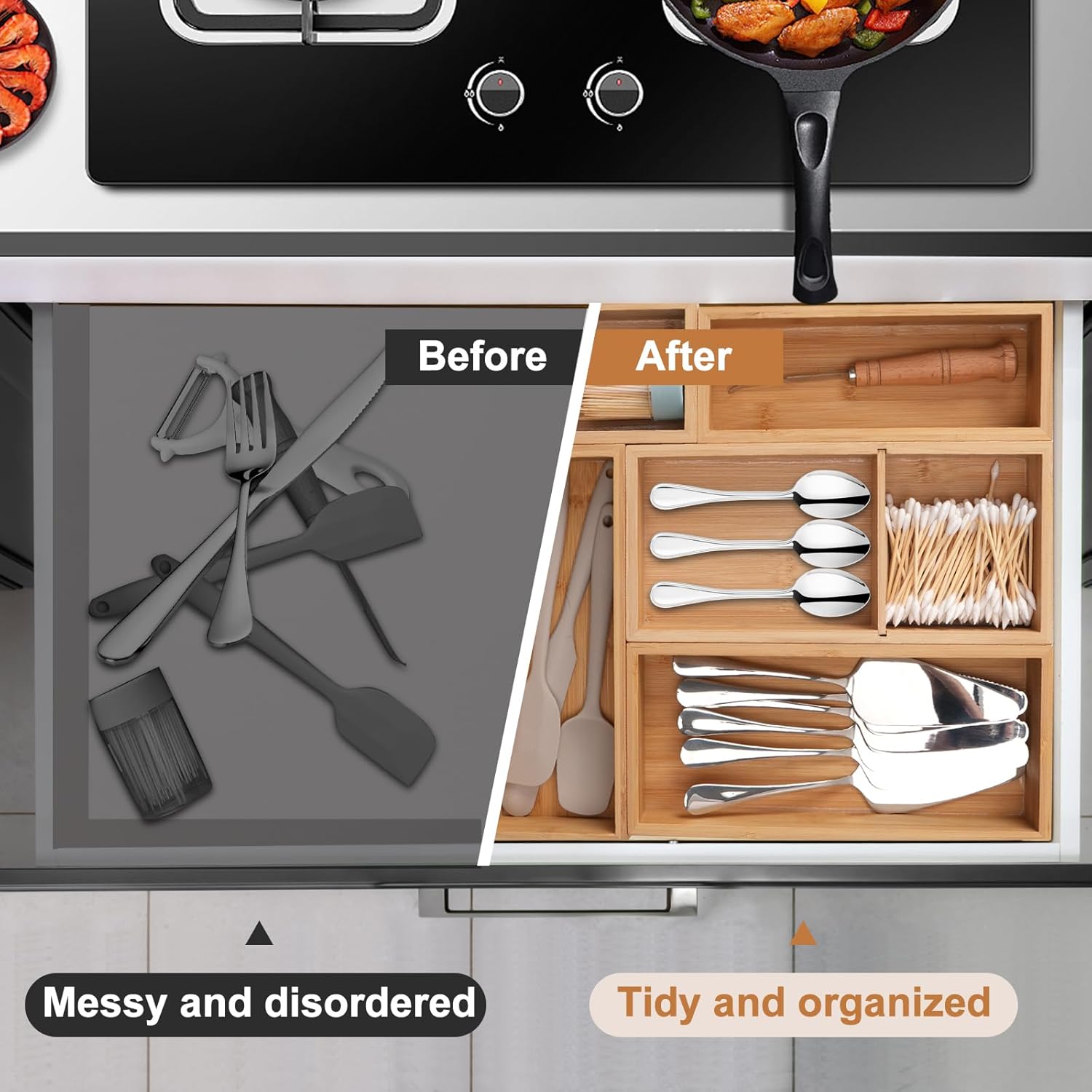 - Bamboo Drawer Organizer:Do you need the ultimate storage essentials to stay organized? Look no further than this indispensable and versatile bamboo organizer set! This 5-piece bamboo drawer organizer set is perfect for keeping your home clutter-free and organized. Whether you're storing makeup, jewelry, office supplies, or kitchen essentials, these stylish bamboo organizers are ideal for everyday use