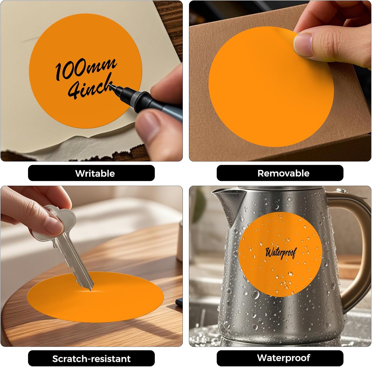 - Waterproof: Circle stickers are resistant to water, which makes them suitable for use in bathrooms, kitchens and other wet environments. Dot stickers are not printable, but can be easily written on with Oil-based pens.