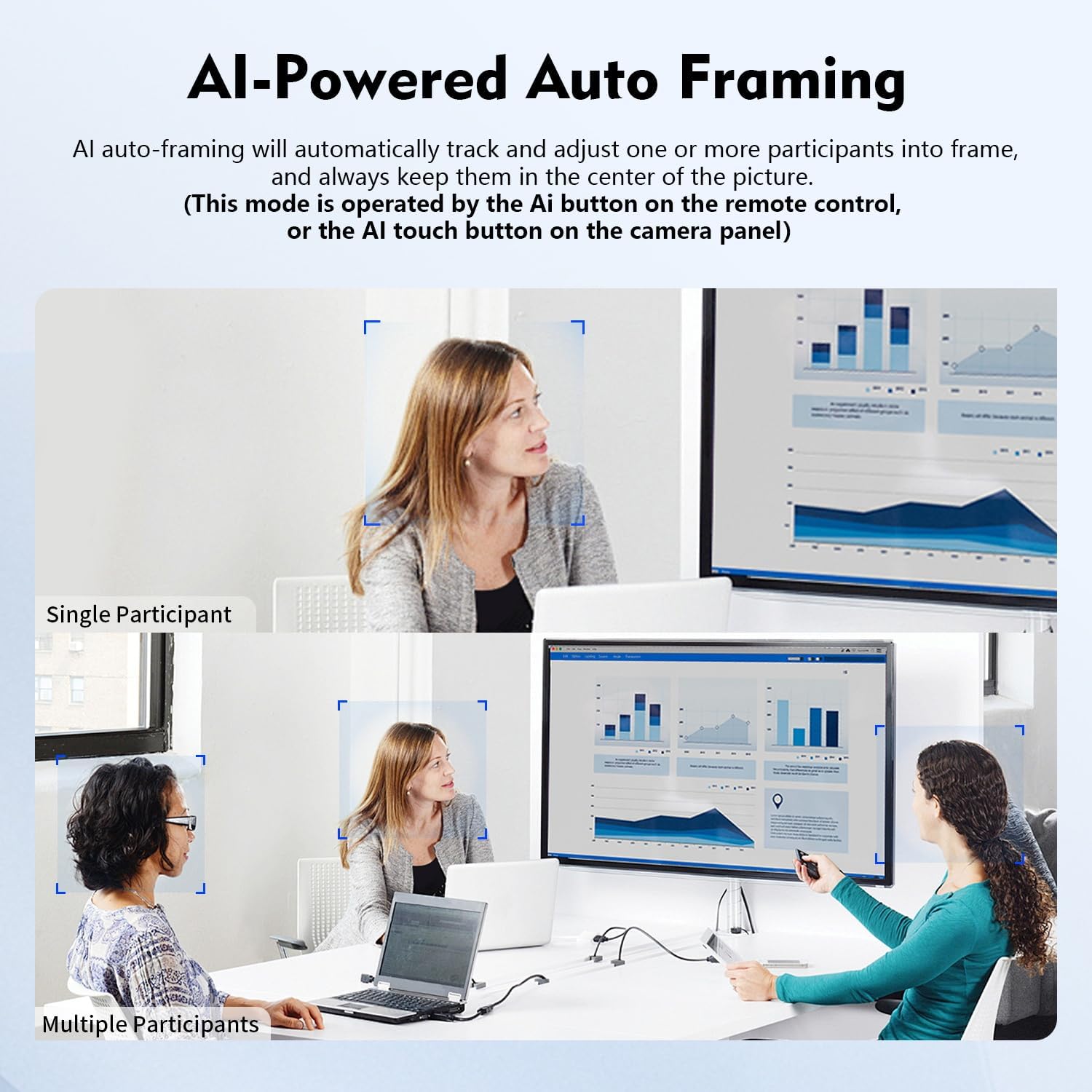 - 【AI Tracking with Auto-Framing】 AI-powered auto-framing will automatically track and adjust one or more participants into frame and always keep them in the center of the picture. (This mode is operated by the Ai button on the remote control, or the AI touch button on the camera panel)