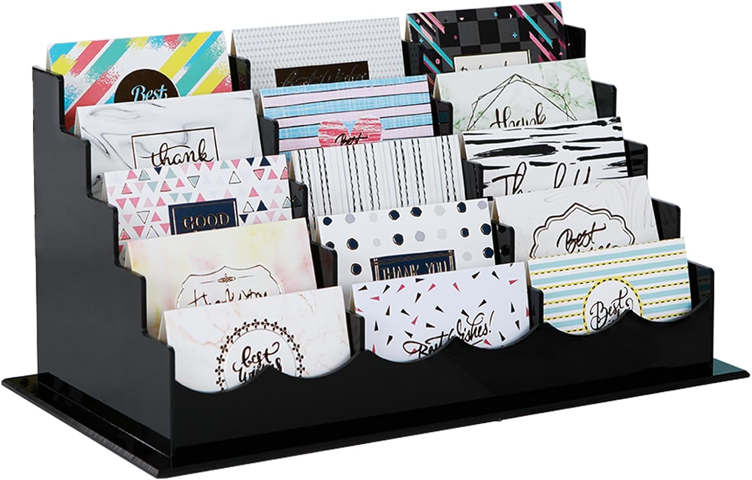 - STURDY CARD STAND - This acrylic desktop business card holder is built to last. Measuring 12.8 inches in length, 6.8 inches in width, and 6.4 inches in height,5 tiers 15 pockets, it can sit securely on any counter or desktop. This make it perfect for a variety of settings, including small businesses, individual departments, reception desks, and trade shows.