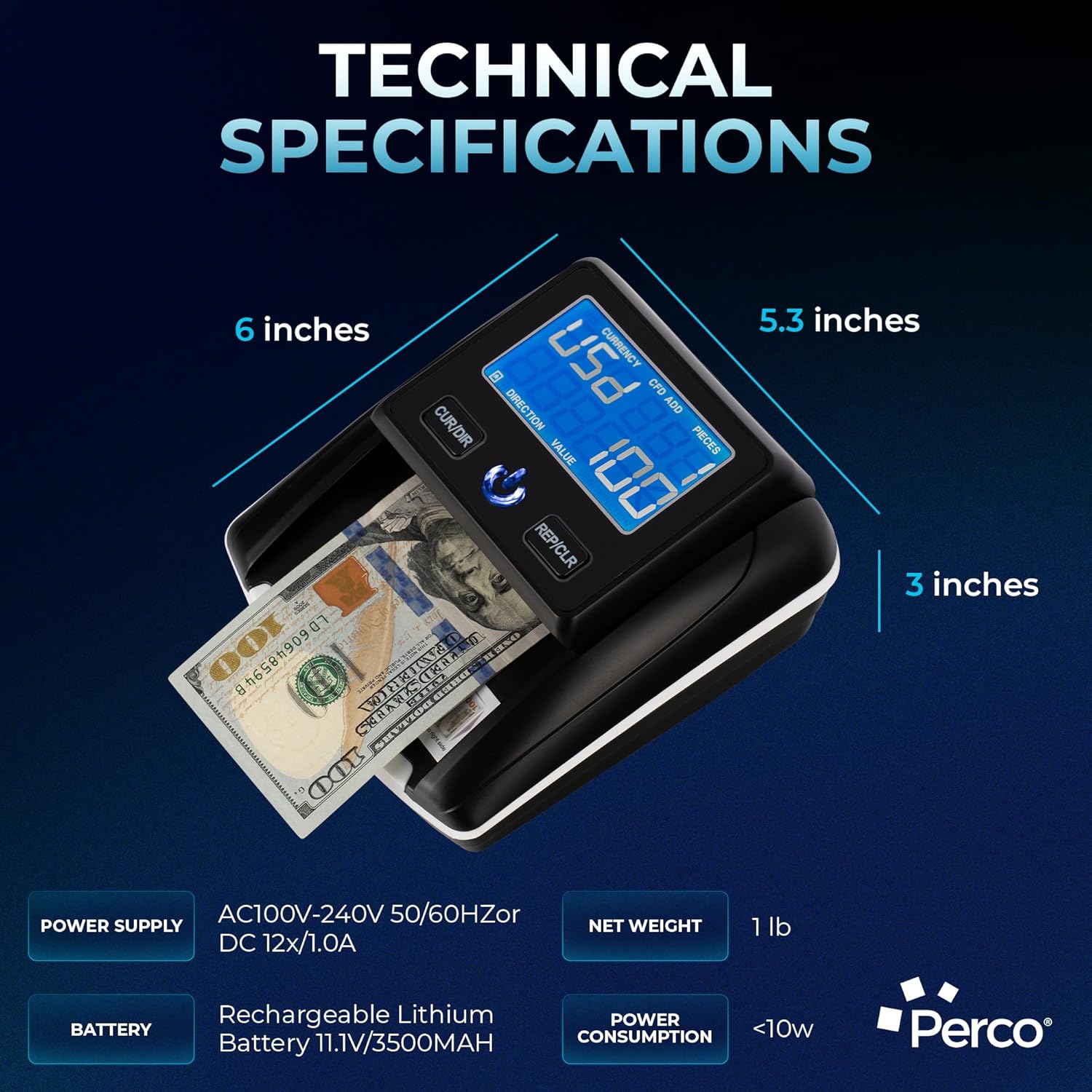 Perco Portable Counterfeit Bill Detector with UV/MG1/MG2/IR Smart Detection, Compact Lightweight Design – Money Checker for Small Business, Retail, and On-The-Go Use