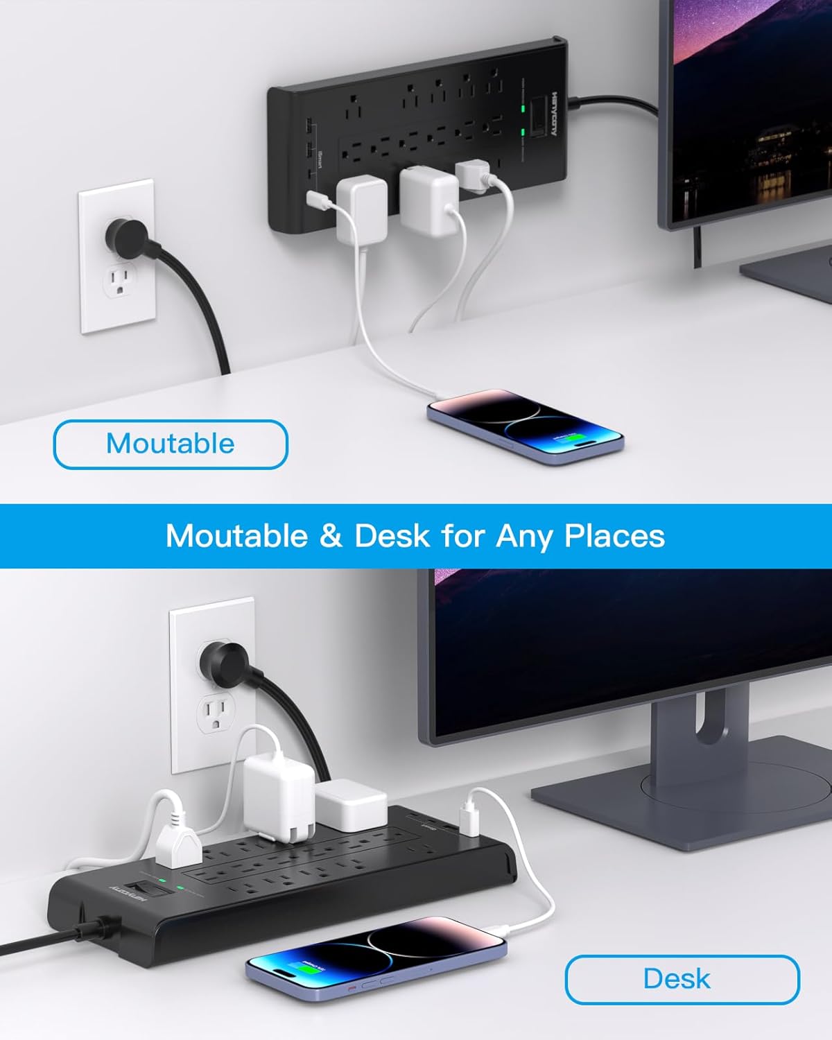 - Surge Protector Power Strip with USB C Ports: 4 USB ports total 3.1 A, each USB A port features 2.4A Max output. USB C charging port features 3A MAX. Built- with smart technology, detecting charging devices and deliver optimal charging speed automatically, compatible with most USB devices.