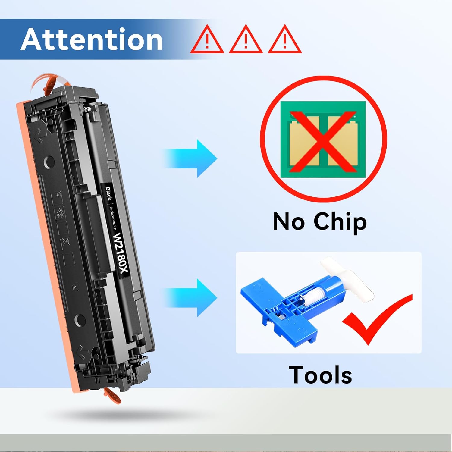 - 【Without Chips】: There are No Chips in our MYTONER W2180X 218X Toner Cartridges 4 Pack Set, but we Provide Tools to Remove The Chip From The OEM Toner Cartridge, Please Refer to the Pictures or Video on Our Details Page for DetailedInstallation Guidance.