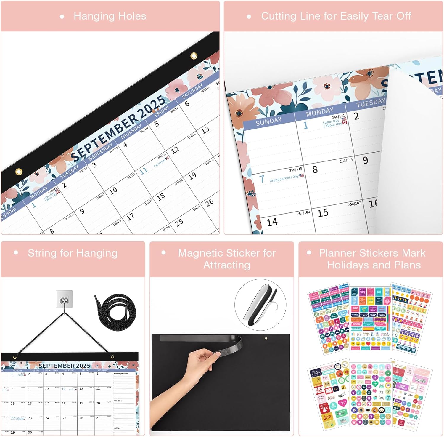- Humanized Design: The calendar set includes a detachable string, a magnetic sticker and planning stickers. The wall calendar can be easily hung through the string and magnetic sticker provided. A variety of planning stickers can also add some interest to the calendar.