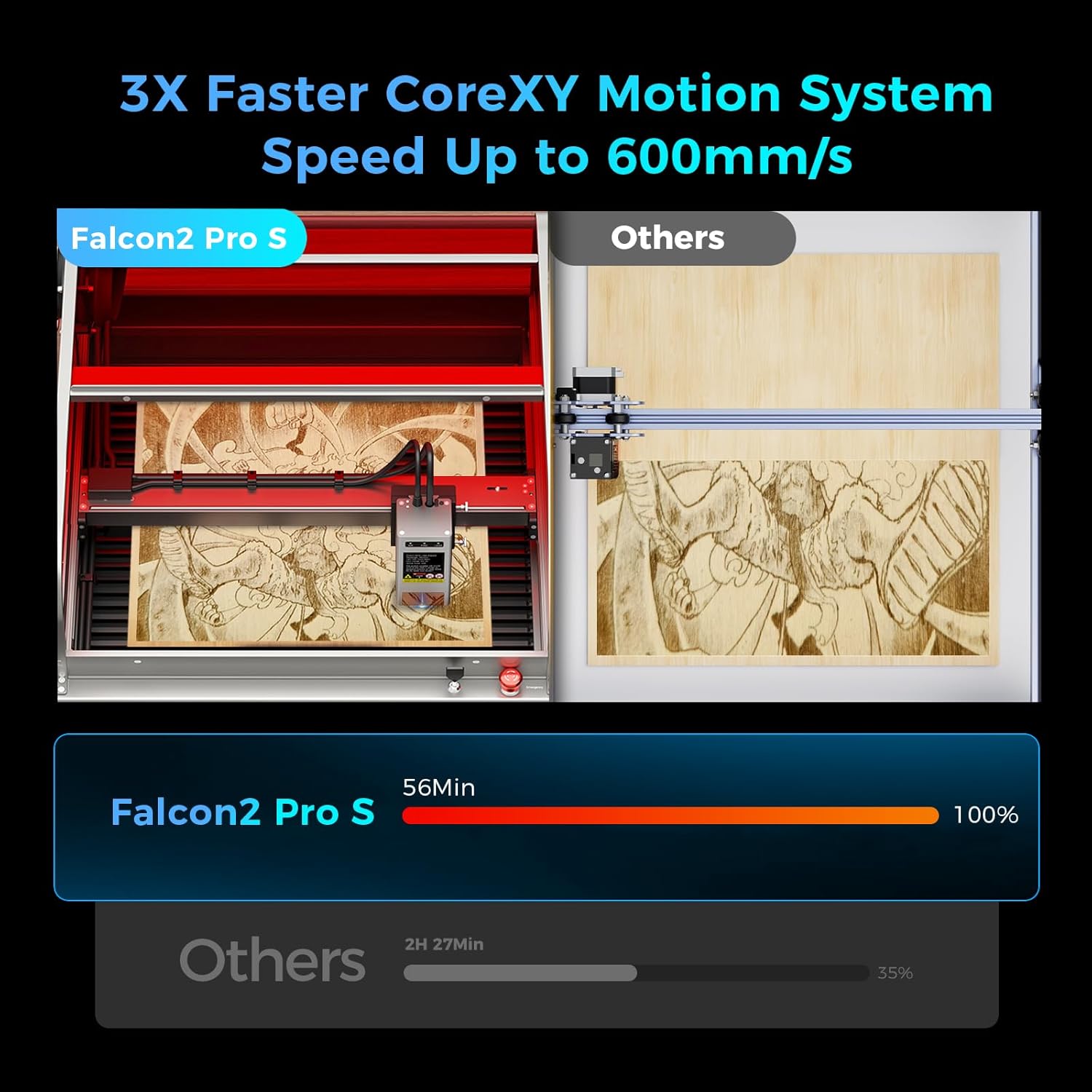- Competitive Performance:The Falcon 2 Pro 22W laser machine can effortlessly cut through 12mm wood and 10mm dark opaque acrylic in a single pass, saving you up to 50% of time compared to other laser machines. With a cutting speed exceeding 600mm/s and laser focusing down to 0.06*0.08mm for fine details, this machine offers precise engraving and cutting for a variety of materials, making it ideal for small businesses seeking high performance.