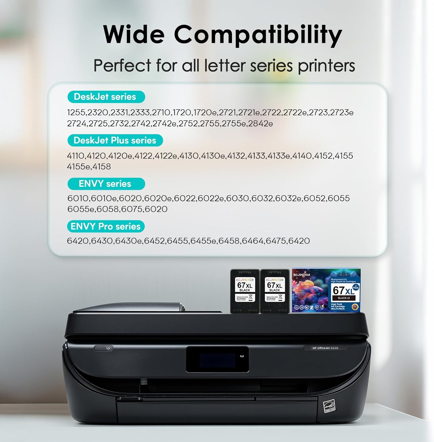 - Broad HP Compatibility: EcoVictor 67 hp ink cartridge replacement for hp deskjet 2700 ink cartridges will work flawlessly with (1)HP ENVY 6010 6010e 6020 6020e 6022 6022e 6030 6032 6032e 6052 6055 6055e 6058 6075 6420 6430 6430e 6452 6455 6455e 6458 6464 6475 (2)HP DeskJet 1255 2320 2331 2333 2710 2720 2720e 2721 2721e 2722 2722e 2723 2723e 2724 2725 2732 2742 2742e 2752 2755 2755e 4110 4120 4120e 4121 4121e 4122 4122e 4130 4130e 4132 4133 4133e 4140 4152 4155 4155e 4158 printer ink.