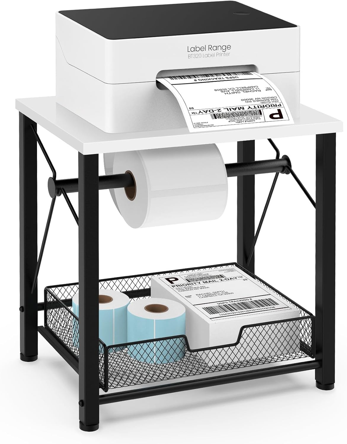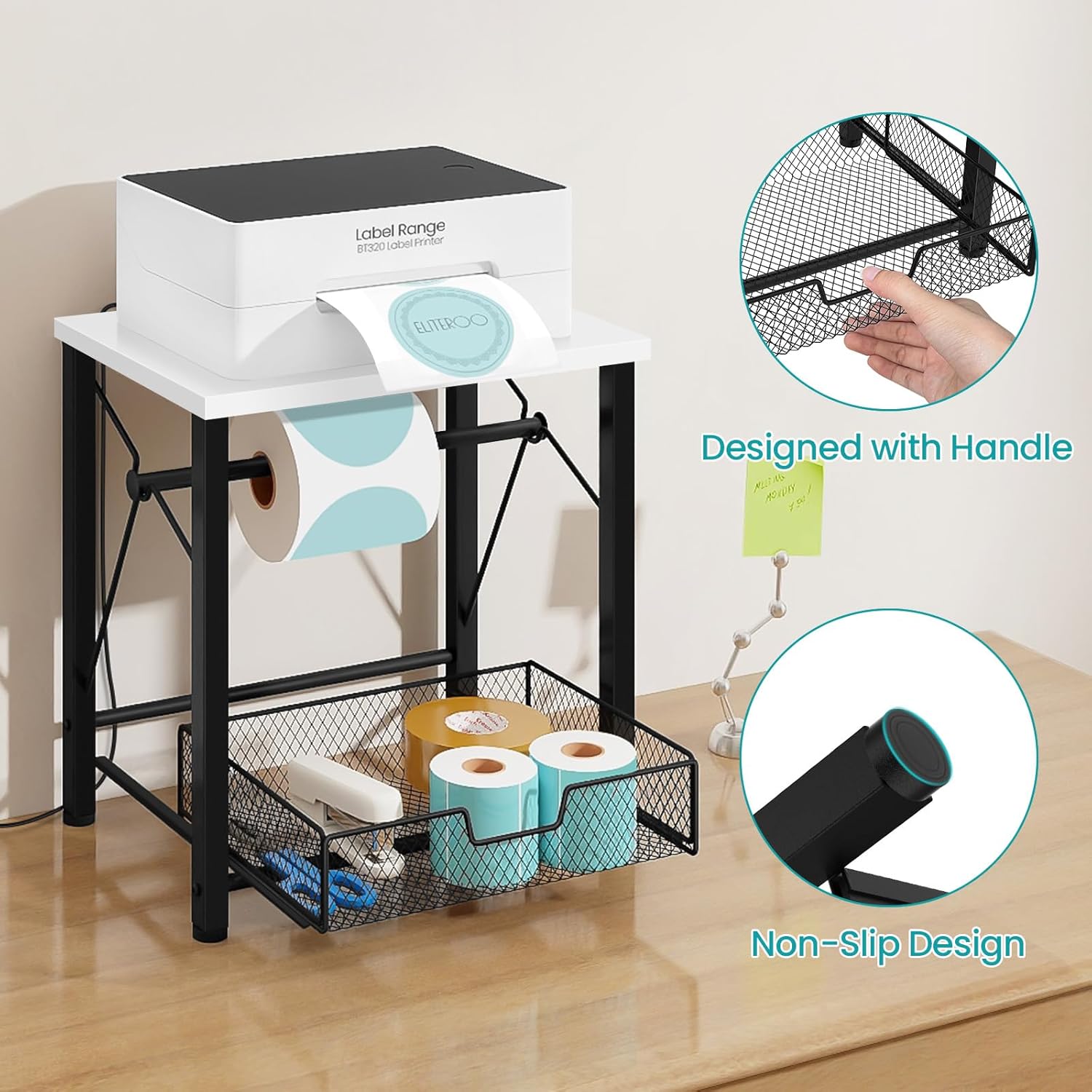 - 【All-in-One Label Holder with Drawer】 This label holder is designed to efficiently store both printers and labels, maximizing workspace organization. The top layer holds the printer, while the lower section features a wooden pole for label rolls and a bottom drawer for extra office supplies. A perfect space-saving solution for an organized and clutter-free desk.