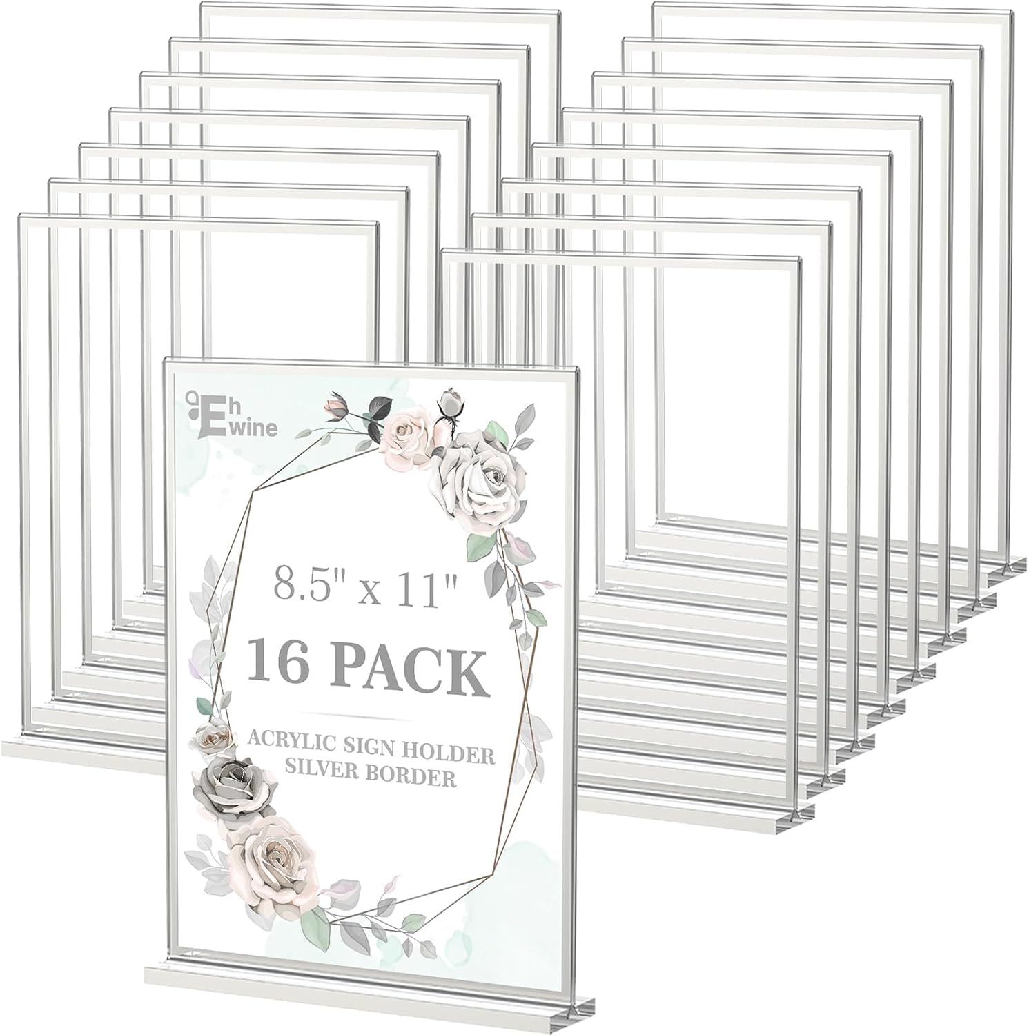 EHWINE 16 Pack Acrylic Sign Holder 8.5 x 11, Double-Sided Tabletop Silver Sign Holder, Clear Acrylic Picture Frame Menu Flyer Paper Holder Display Stand for Home Wedding Party (with Non-Slip Pads)
