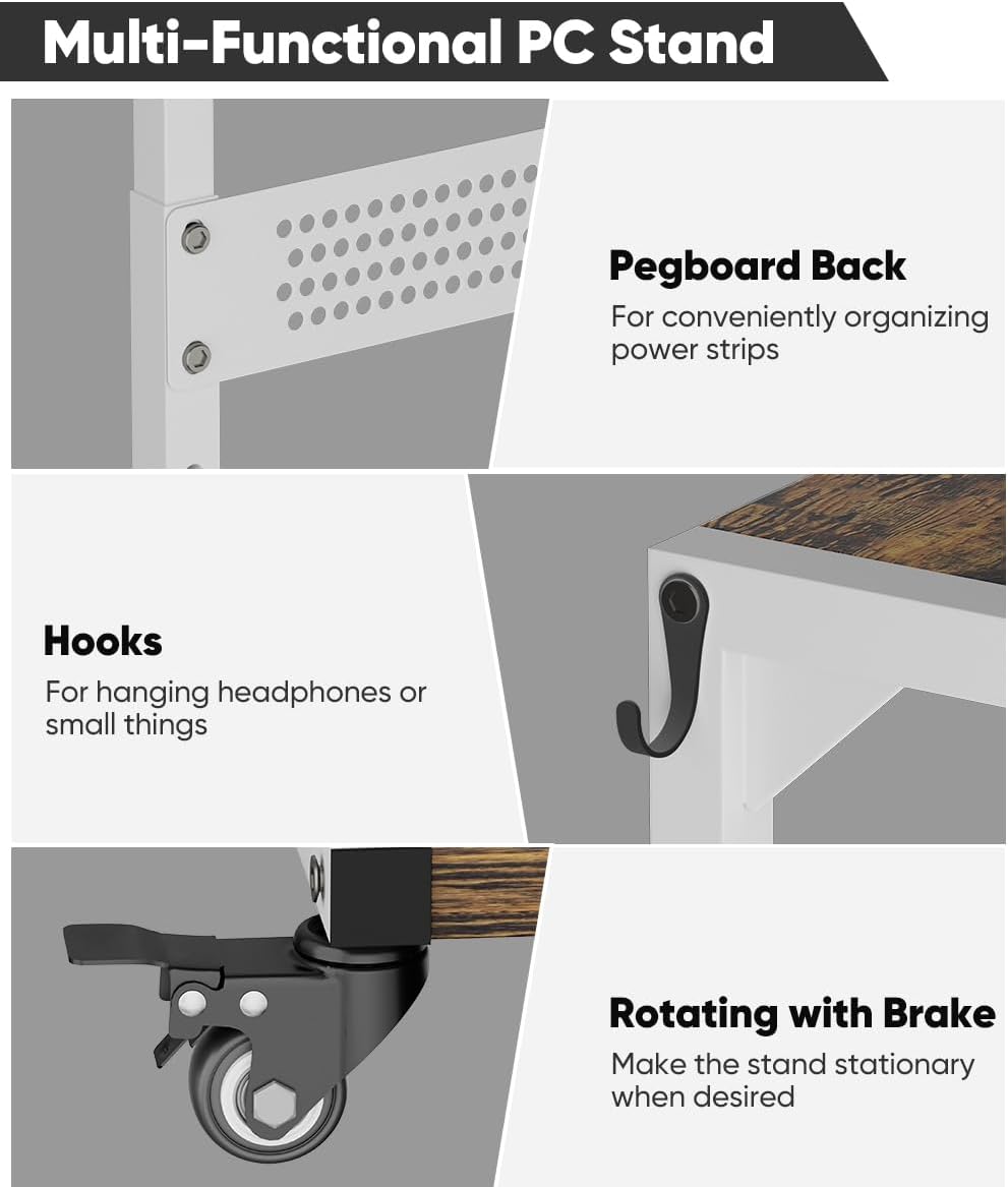 - Multi-Functional PC Stand: This two-tier design offers ample storage space, overall dimensions: 12.99'' L x 16.54'' W x 28.74''H. The top of this pc stands for floor is suitable for organizing items such as small printers, plants, magazines, and more. Featuring a pegboard on back, this pc floor stand can conveniently organize the power cords, making your space cleaner and neater. It also equip four side hooks for hanging headphones if you need.