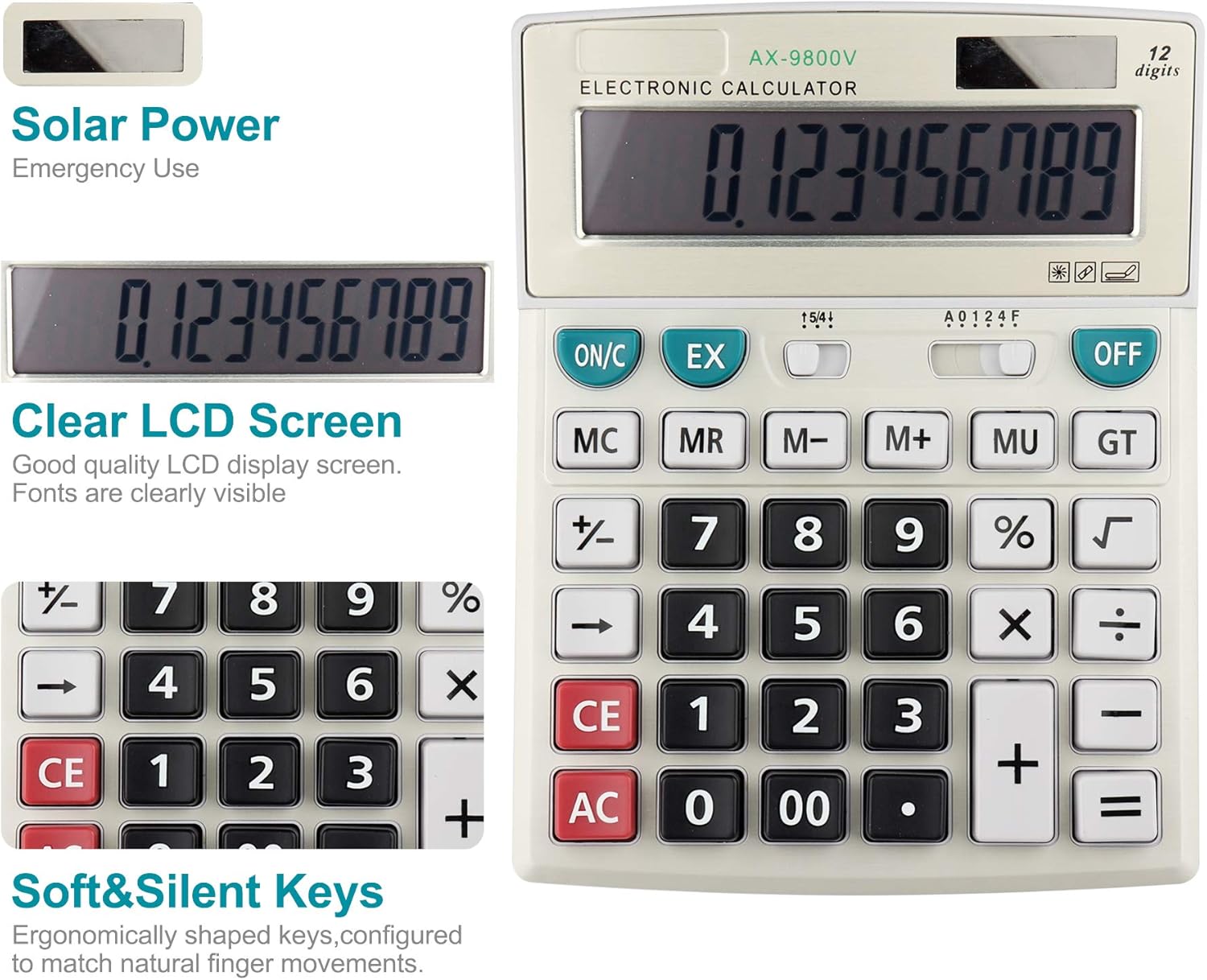 Large Computer Electronic Calculator Counter Solar & Battery Power 12 Digit Display Multi-Functional Big Button for Business Office School Calculating (HY-9800v)