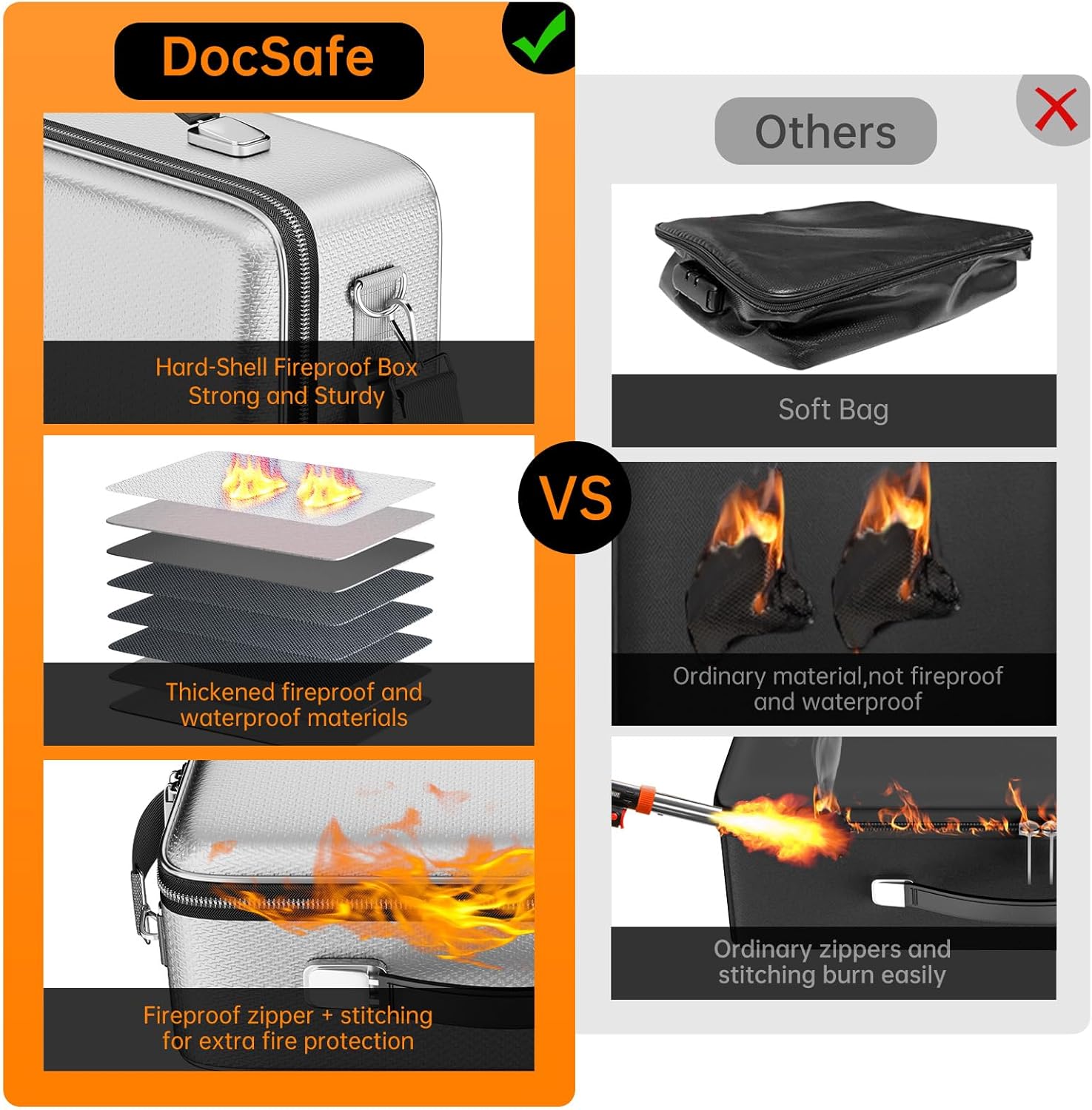 - Ultimate Fireproof & Water-Resistant Protection: Keep your valuables safe with our Hard-Shell fireproof document box. It is made of thickened silicone coated fireproof heat insulated cotton material and hard-shell material which can stands up against fire and passed the SGS TEST(UL-94 VTM-0 Burning Test). The upgraded fireproof metal zipper is made of high-strength metal teeth and fireproof stitching, which can effectively block the flame and completely protect the documents from being damaged