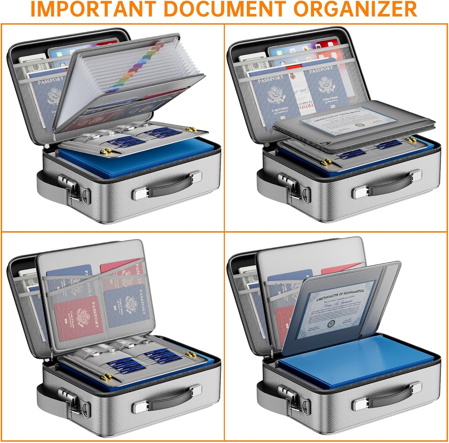 - Large-capacity: Outside size: 15.2" x 11.22" x 5.3". Internal size: 14.8" x 10.8" x 4.5". Our fireproof document box adopts a multi-layer design that can meet all your storage needs. These include 13 accordion Pockets with labels,1 zipper pocket,4 pen slot,14 card slots,4 passport holder,4 small mesh bags,4 mesh bags,and 1 main pocket. It can store your important documents,money,passport,U Disk,cards,laptop,certificates in a safe and orderly way. Perfect for daily file filing and storage