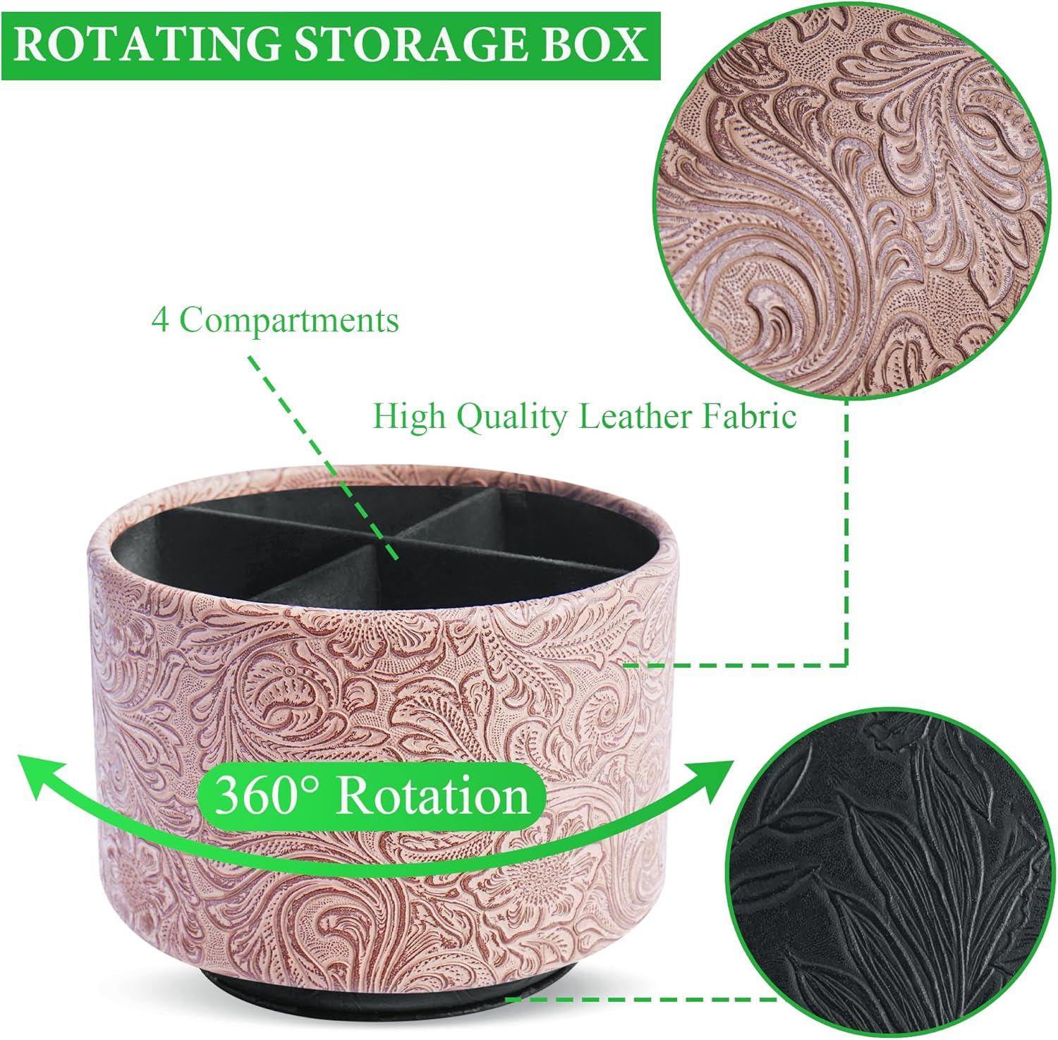 lizimandu Round Leather Art Supply Organizer,Remote Control Holder,360 Degree Spinning,Multi-Functional Pencil Holder,4 Compartments Desktop Stationary Organizer(1-Carved Wood Beige)