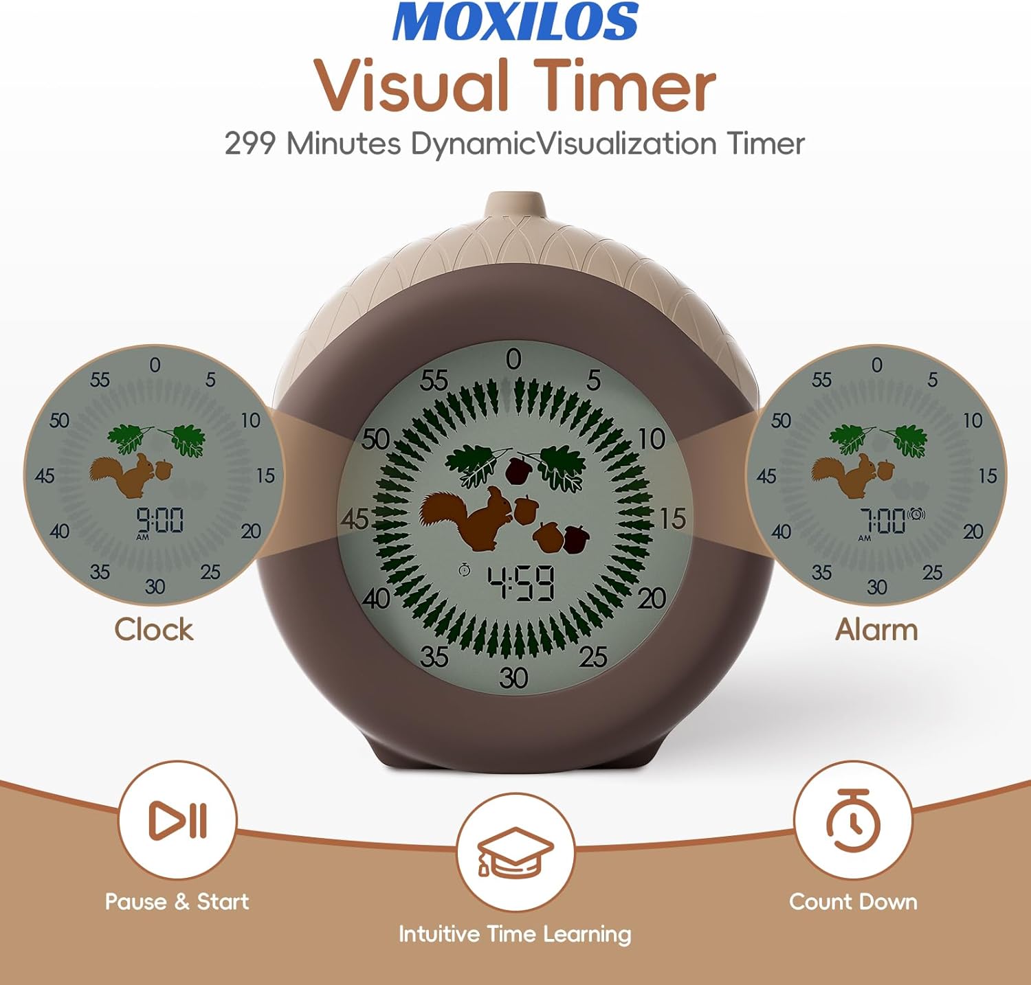Digital Visual Timer for Kids with Protective Case, Hazelnut Theme 299 Minute Cute Squirrel Timer for Classroom Office Kitchen, Time Management Tools for ADHD Children