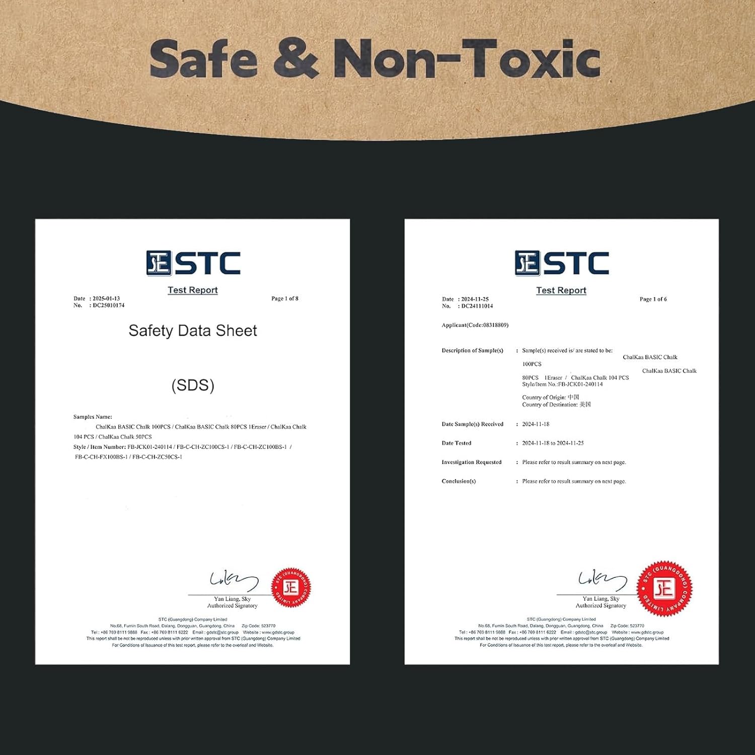 - Safe & Non-Toxic: At Chalkaa, we prioritize the health of our users. Our chalk is non-toxic, passes safety certifications, and meets various standards, making it suitable for all age groups. Whether you're a teacher giving a long lecture or a child engaging in creative art projects, our chalk is safe and healthy to use.