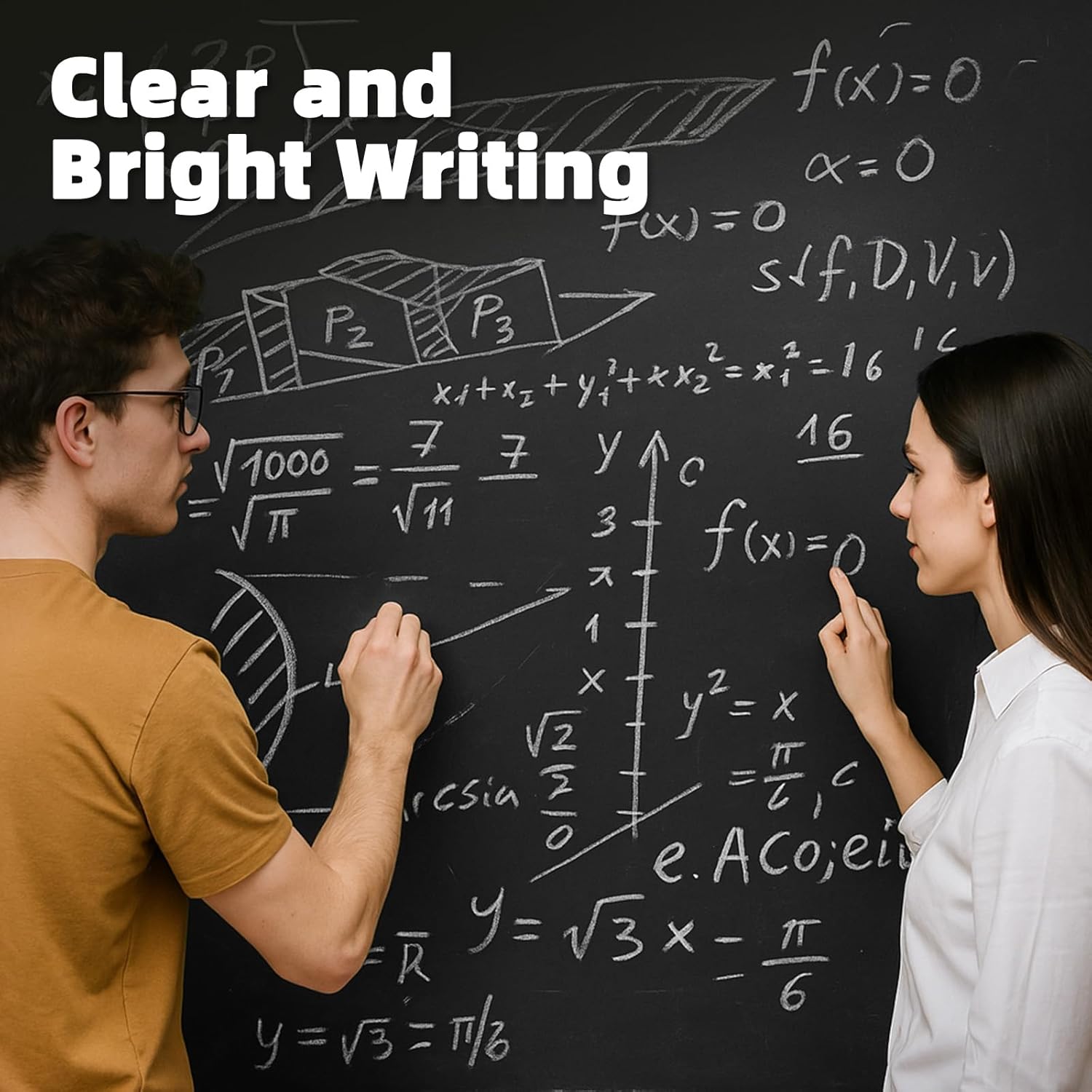 - Smooth Writing & Effortless Erasing: The chalk delivers strong adhesion and vibrant color saturation, producing uniform, deep-toned lines on blackboards without uneven fading. Its dust-free design minimizes airborne particles—dry wiping requires only gentle friction, while wet wiping dissolves chalk residue completely.