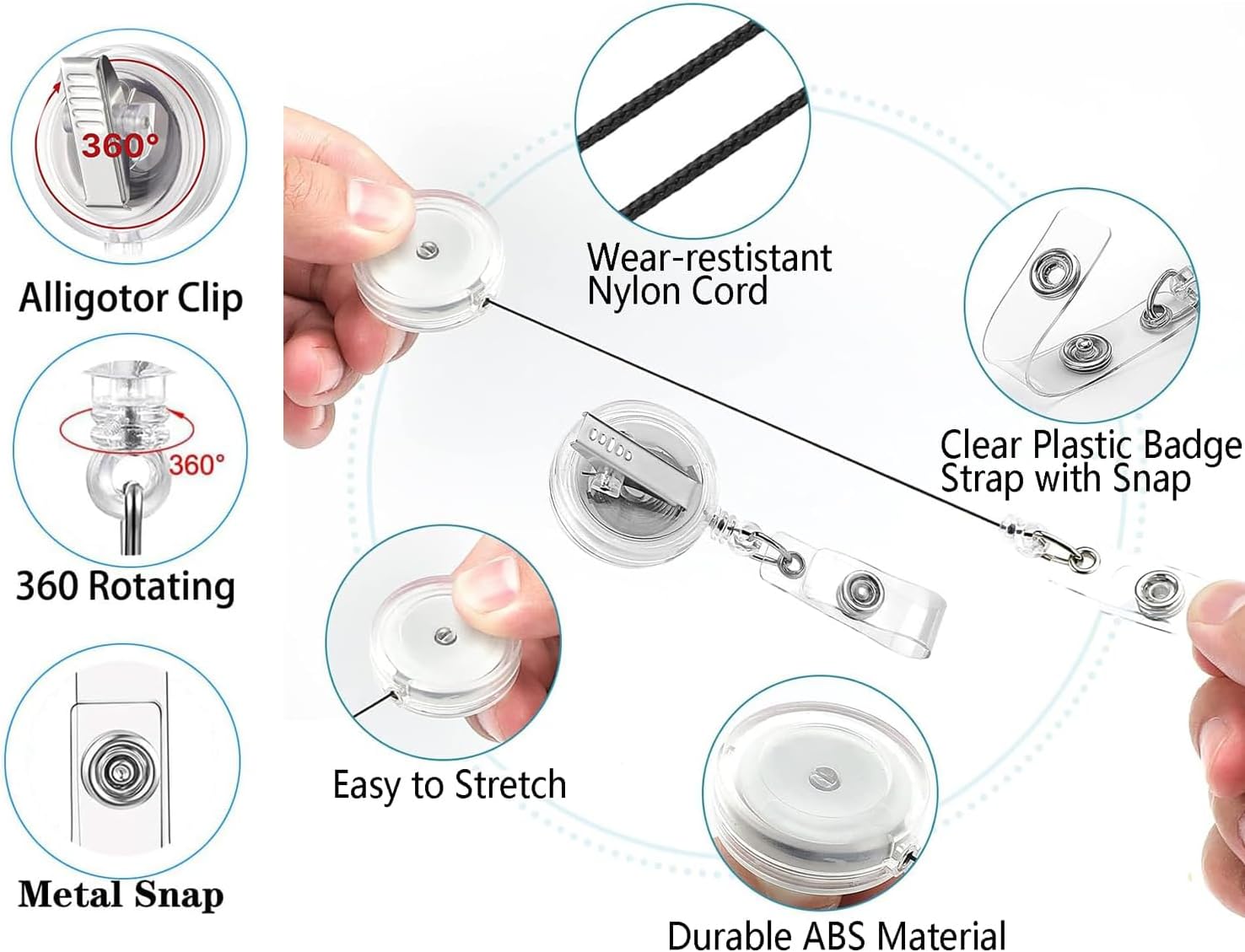 - Effortless Convenience: The ID Card Holder boasts a retractable design, up to 24 inches long, ensuring seamless scanning for office entry and exit.The alligator clip nursing badge reel securely attaches and rotates 360 degrees, adding flexibility and ease of use.No fuss, just fun!