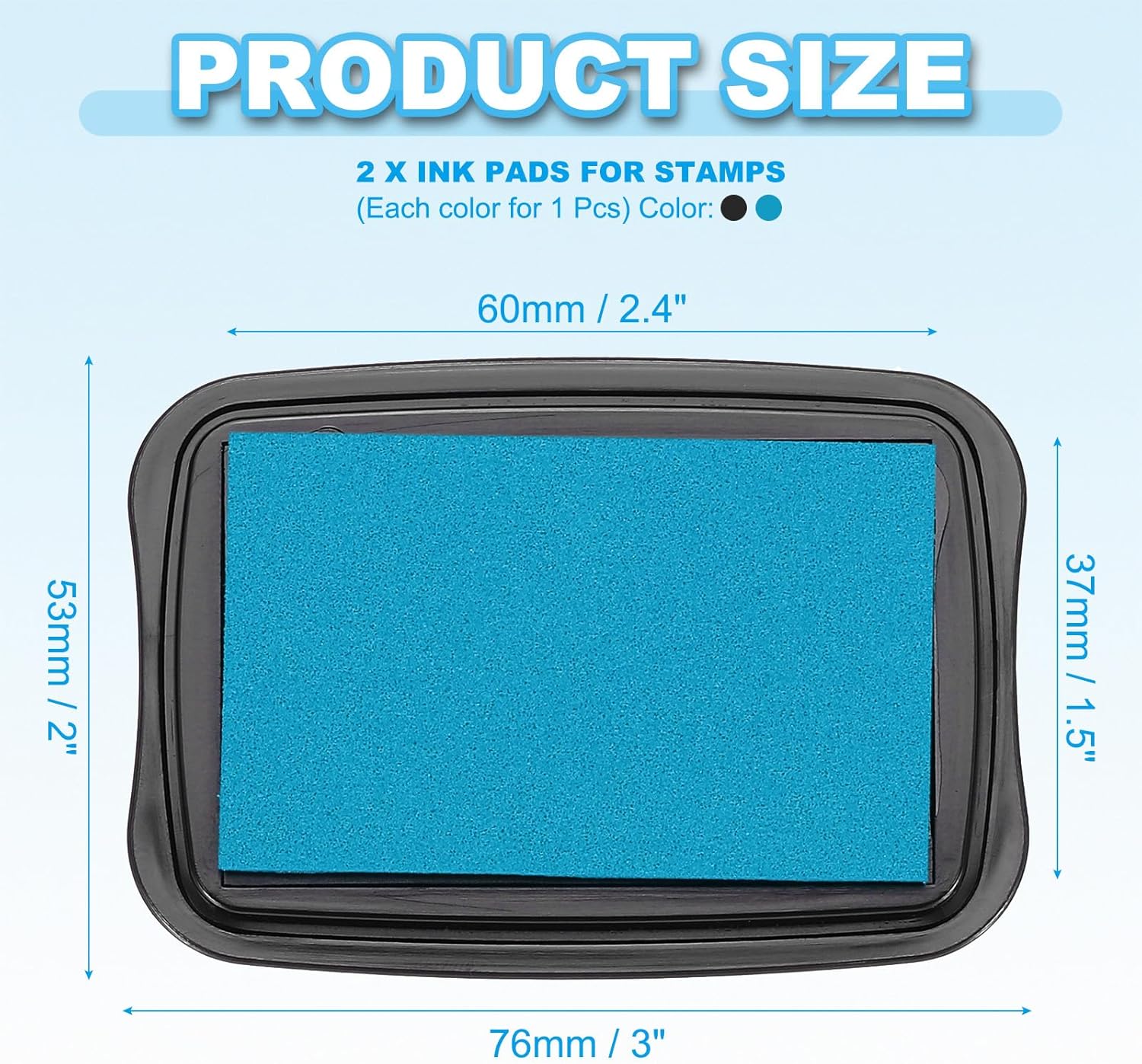 - Color: Blue, Black; Material: Sponge, Plastic; Ink Pad Size: 60 x 37mm / 2.4 x 1.5 inch(L*W); Overall Size: 76 x 53 x 18mm / 3 x 2 x 0.7 inch(L*W*T); Packing List: 2 x Ink Pads for Stamps