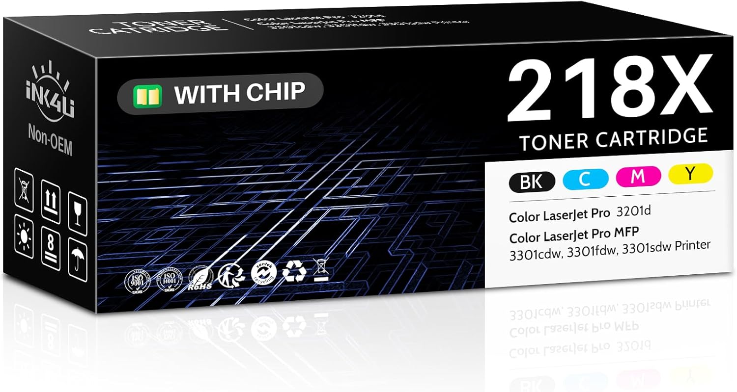 - 【Advanced Smart Chip Technology】INK4U compatible toner cartridges replacement for HP 218X toner cartridges 4 pack with chip, upgraded intelligent chip ensures instant printer recognition for HP Color LaserJet Pro 3201dw, HP Color LaserJet Pro MFP 3301cdw/3301fdw/3301sdw and seamless compatibility. No installation hassles - works like original cartridges.