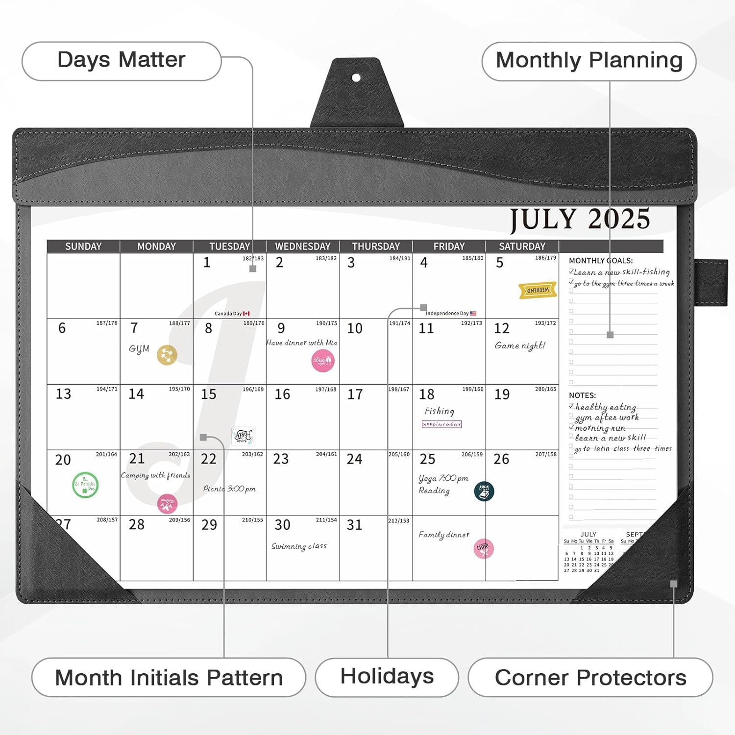 Ospelelf Desk Calendar 2025-2026 Large 12"x17" Leather Monthly Planner Pad with Protective Cover 18 Months July 2025 to Dec 2026 Black Gray