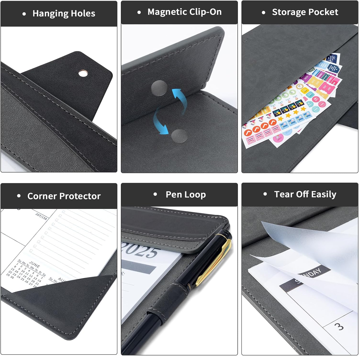 - Durable and Functional Use: Plastic cover can protect the calendar from dust and water pollution;the corner protectors can make the page corner of the calendar not easy to fold. Featuring a dedicated slot for pens, this functional loop keeps your favorite writing tool neatly stored and always within reach.