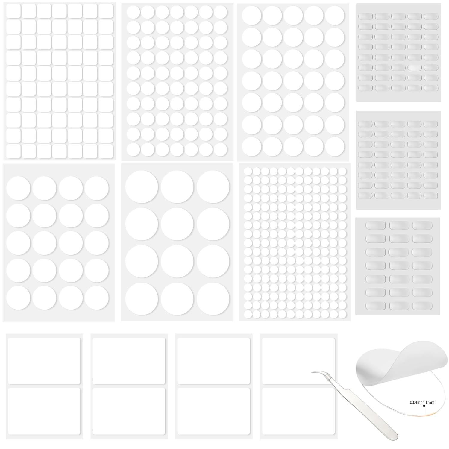 - Double Sided Sticky Tape Dot Set: You will receive 13 pack clear sticky tack in multi shape, 520 pieces totally, include round adhesive dots: 0.39 inch(204 pcs), 0.78 inch(70pcs), 1.18inch(35pcs), 1.57inch(20pcs), 1.96inch(12pcs); small oval: 0.51×0.31 inch(80pcs) ; square: 0.78inch(70pcs); strip shapes: 0.39×0.78inch(21pcs),2.12×3.34inch(8pcs).