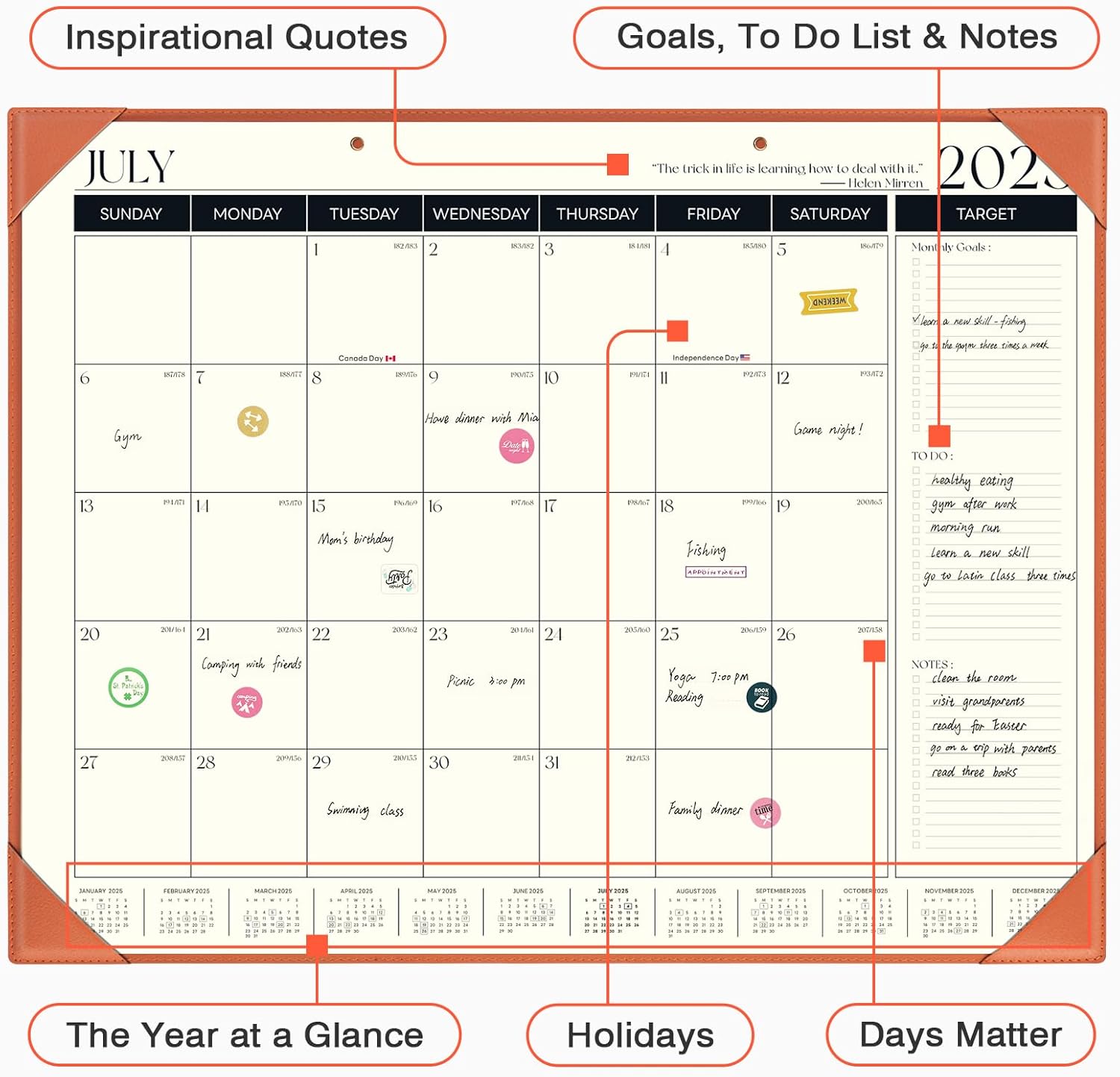Ospelelf Large Desk Calendar 2025-2026 with Protective Cover, 18 Months Planner Pad from July 2025 to Dec 2026, 22" x 17" Wall Calendar with PU Leather Pad for Home or Office, Orange