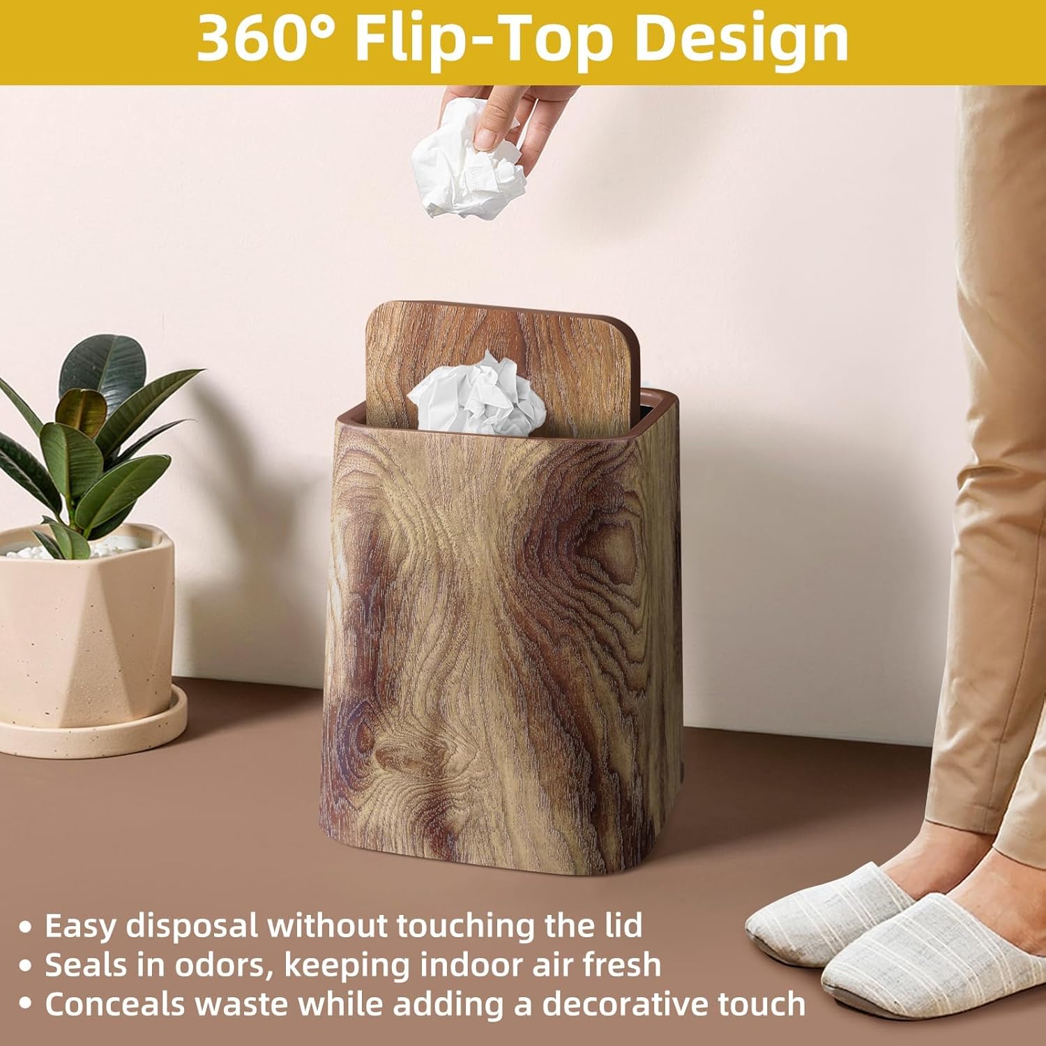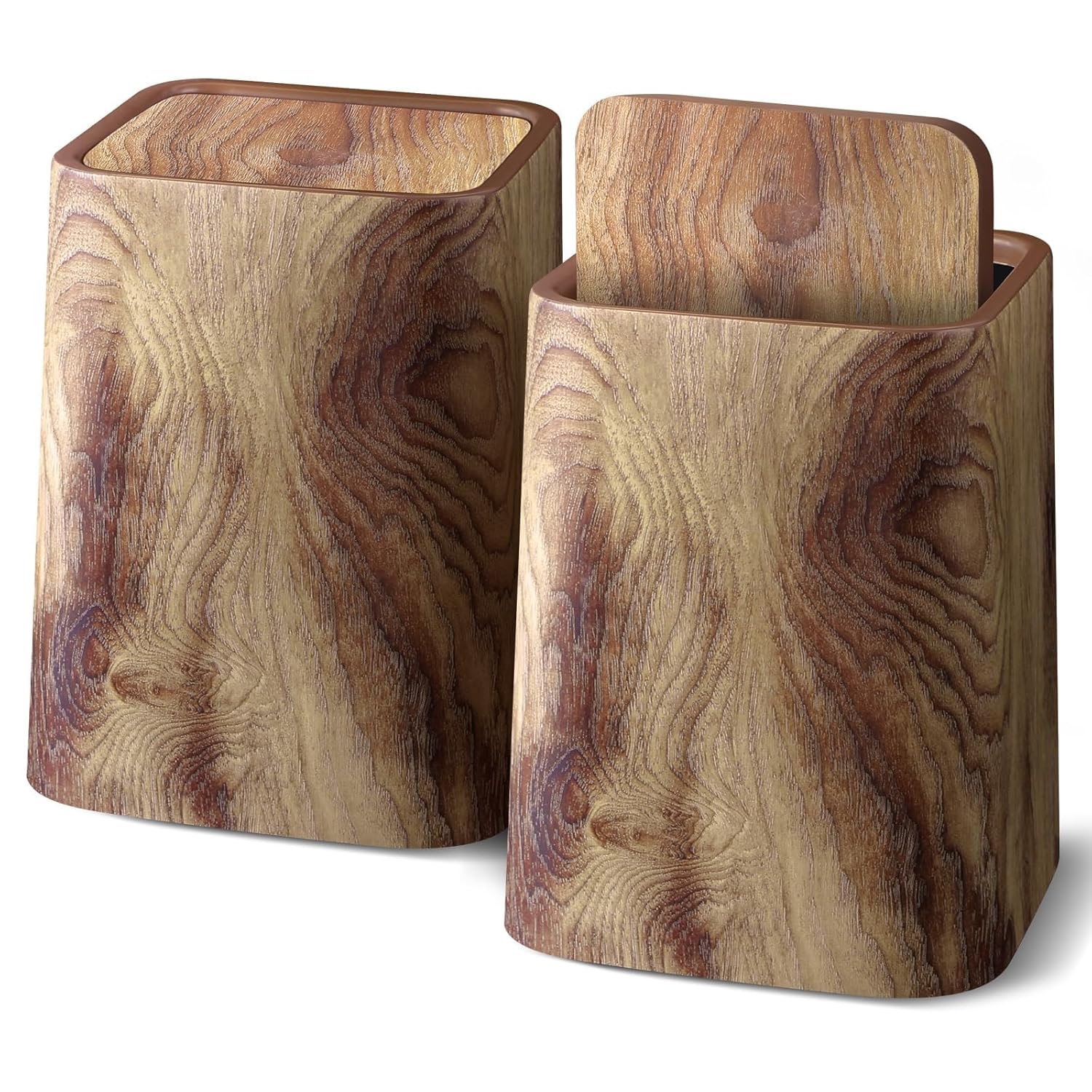 Wood Grain Plastic Trash Can Swing Top Lid, 4Gal/15L Farmhouse Wastebasket Bin Retro Style with Inner Bucket, Bathroom Trash Can Hidden Bag for Room Aesthetic, Square Brown Garbage Can 2pack