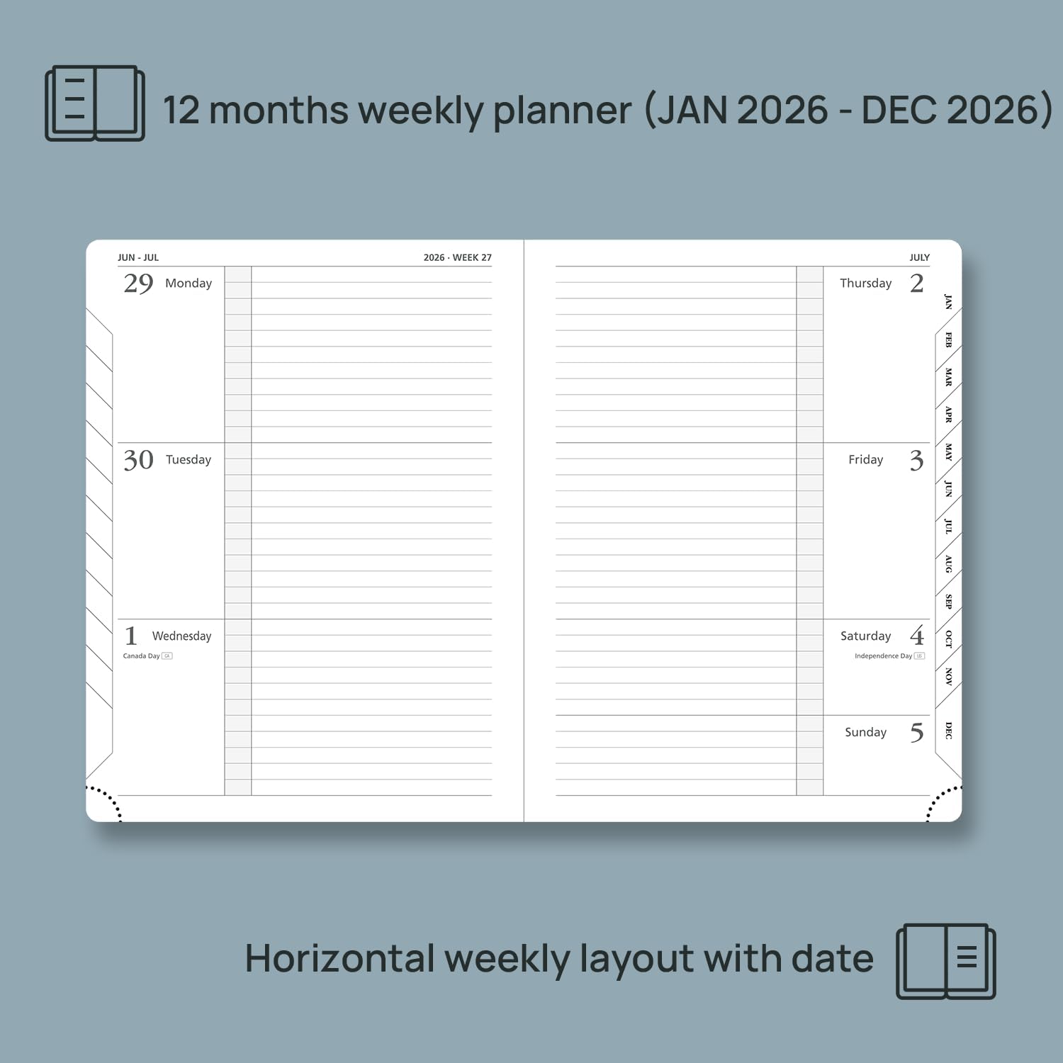 - JAN 2026 - DEC 2026 WEEKLY PLANNER: The size is Medium 6.75" x 8.75", which permits large writting space for your appointments, which makes your busy daily routines organized.