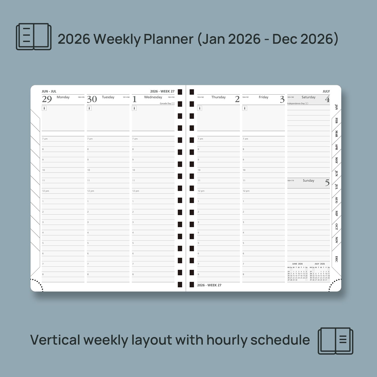 - 2 PAGES PER WEEK:Lay flat week-to-view on 2 pages, this weekly planner (Jan 2026 - Dec 2026) presents spacious everyday planning with hourly schedules for your appointments, which makes your busy daily routines organized.