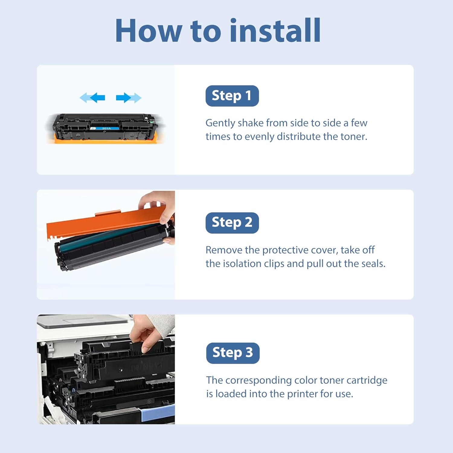 - Easy to install your new replacement for hp 201A 201X toner cartridge, just follow the instructions and get up and running in minutes. Tip: Avoid touching the green drum, as oil stains on your fingers may affect the print quality.