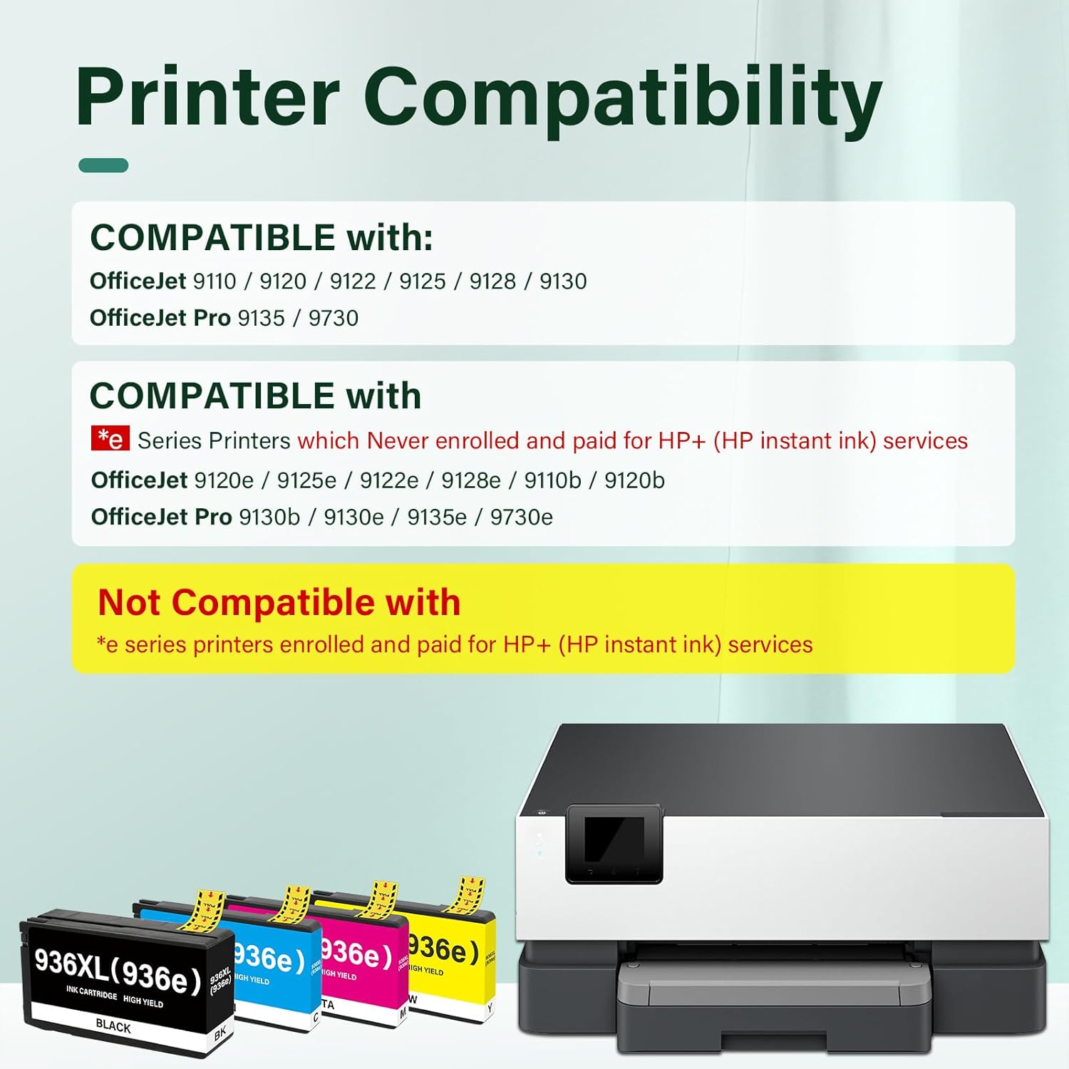 - Compatible Printers: *e series printers which Never enrolled and paid for HP+ (HP instant ink) services, such as OfficeJet Pro 9120e 9125e 9122e 9128e 9110b 9120b 9130b 9130e 9135e 9730e Series Printer