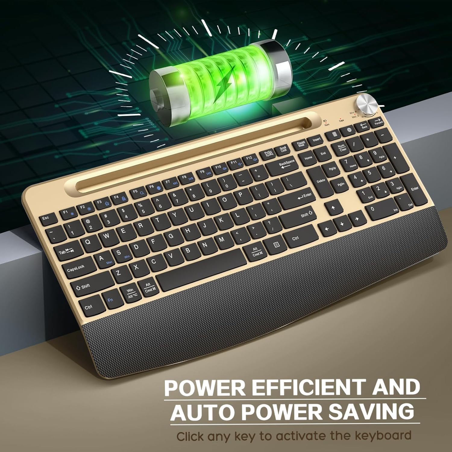 - Wireless Ergonomic Keyboard with Wrist Rest:The gold wireless keyboard is equipped with a wide palm rest and tilted legs, helping you keep your wrists and forearms in a more natural and relaxed posture. The low-profile wireless keyboard makes soft clicks during typing without disturbing others during rest, work or play. The specially designed volume knob enables you to make adjustments more quickly.(No mouse included)