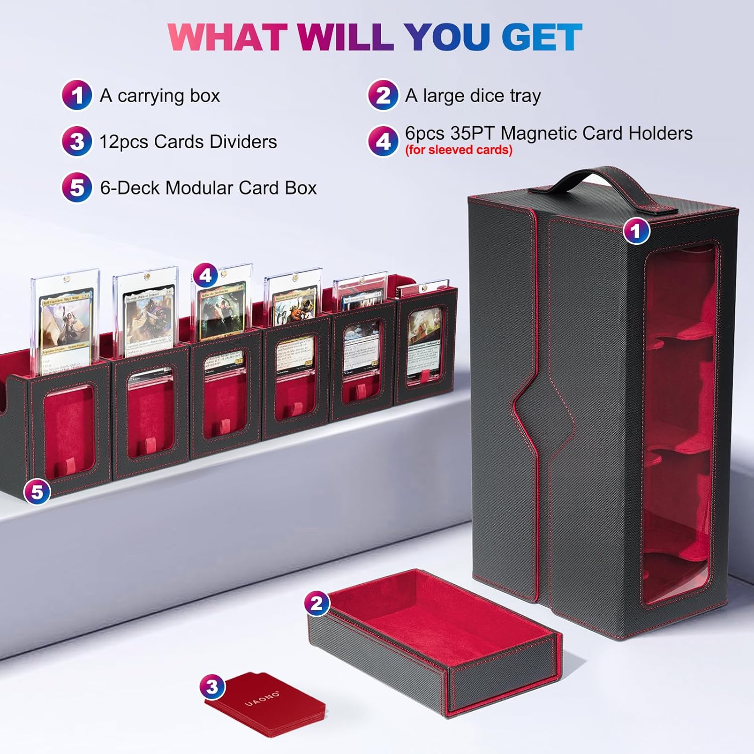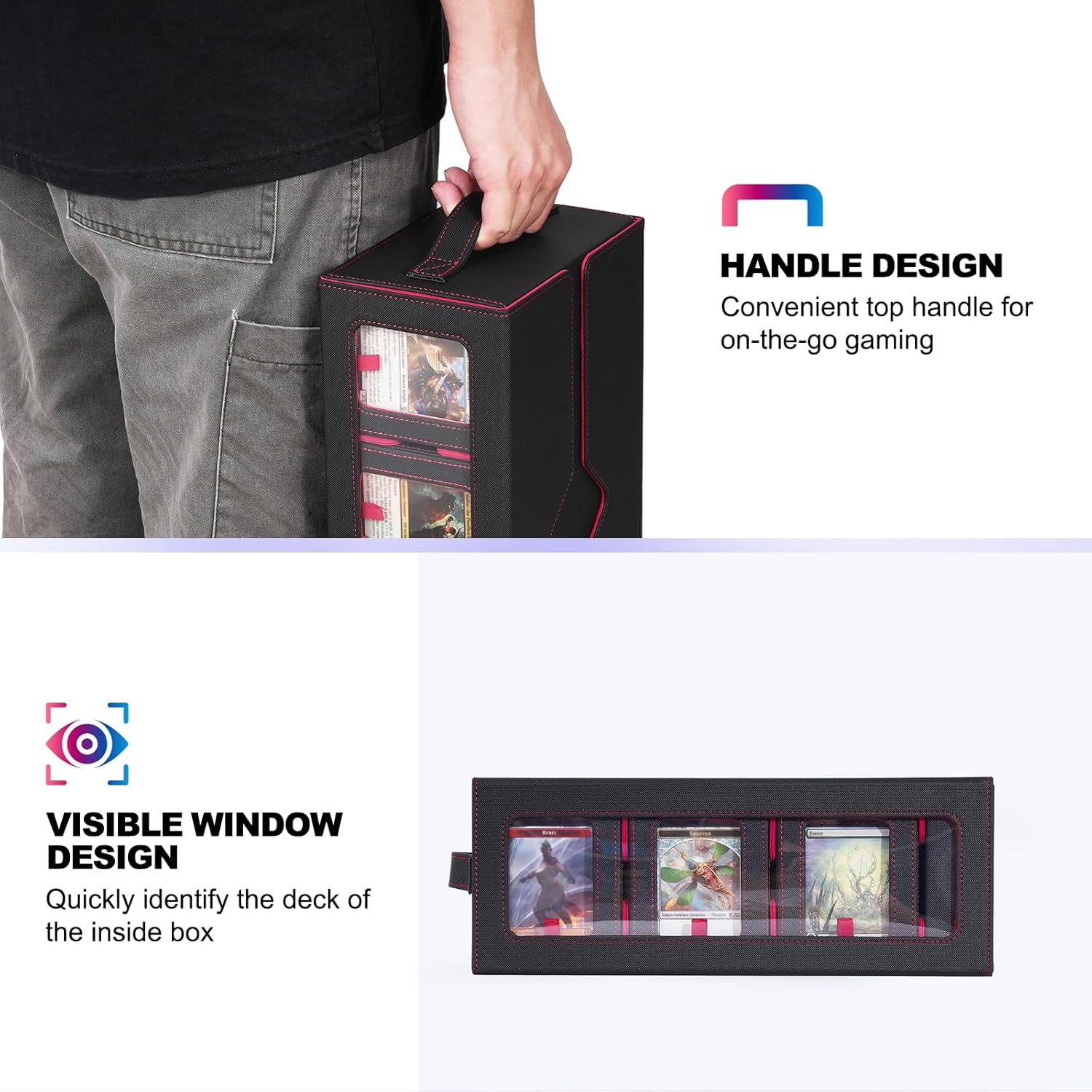 - Practical and Portable: Each modular deck box features a dedicated commander slot equipped with 35PT magnetic card holder for quick identification; The outer storage case includes both a carrying handle and transparent viewing windows on both sides