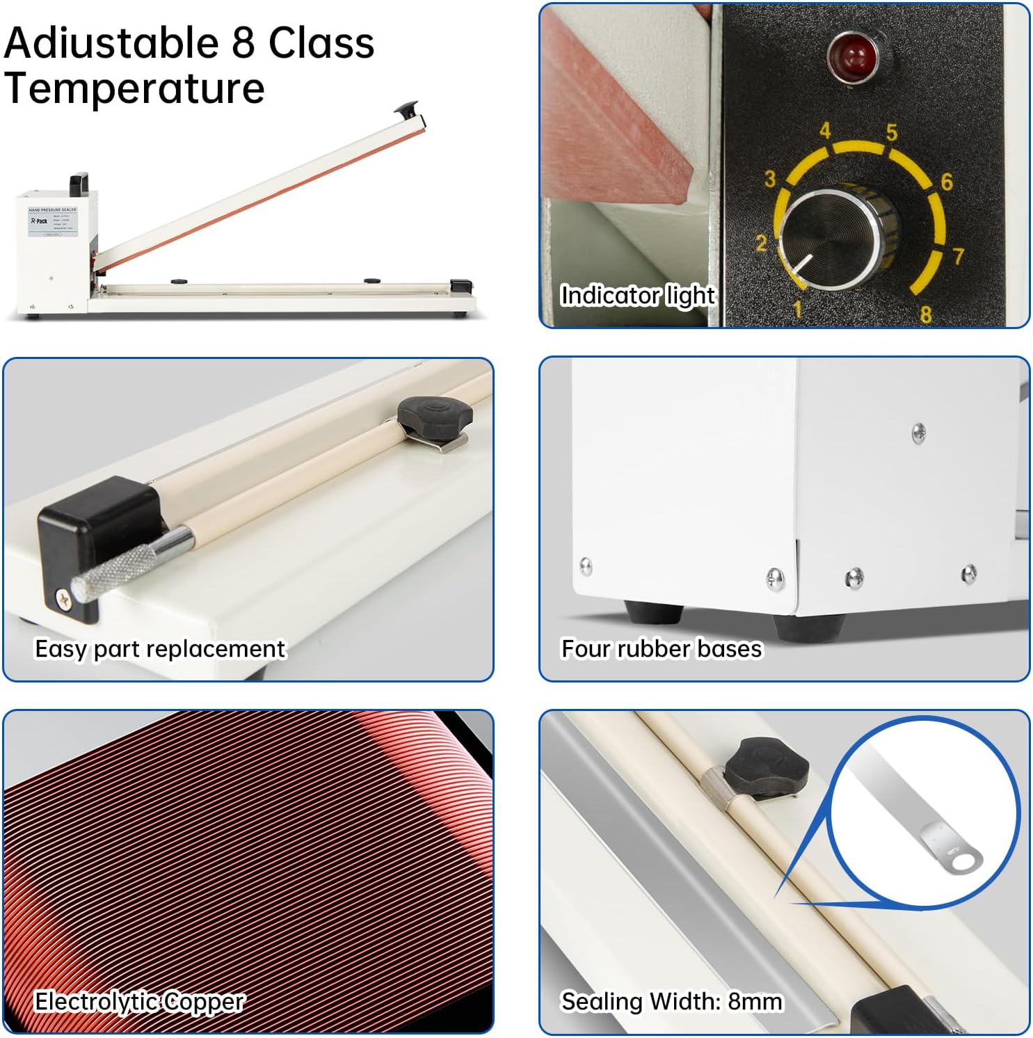 Impulse Heat Sealer with Seal bar, Heavy-Duty Bag Sealing & Cutting Machine, 8mm Sealing Width, 1 Extra Replacement (white, 30 inch)