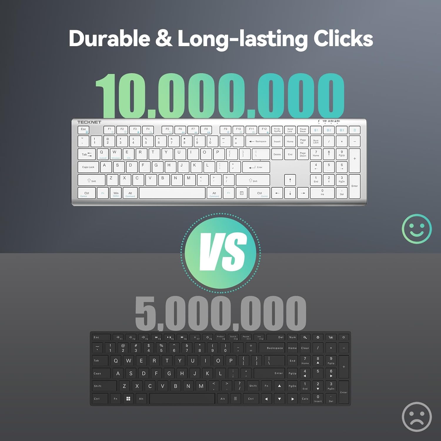 - 【Broad Compatibility】TECKNET slim wireless keyboard compatible with Windows, iOS, macOS, and Android, this wireless bluetooth keyboard is perfect for a wide range of devices including iPads, tablets, smartphones, laptops, desktops, and smart TVs. For devices without Bluetooth, simply use the included USB receiver for a stable connection.