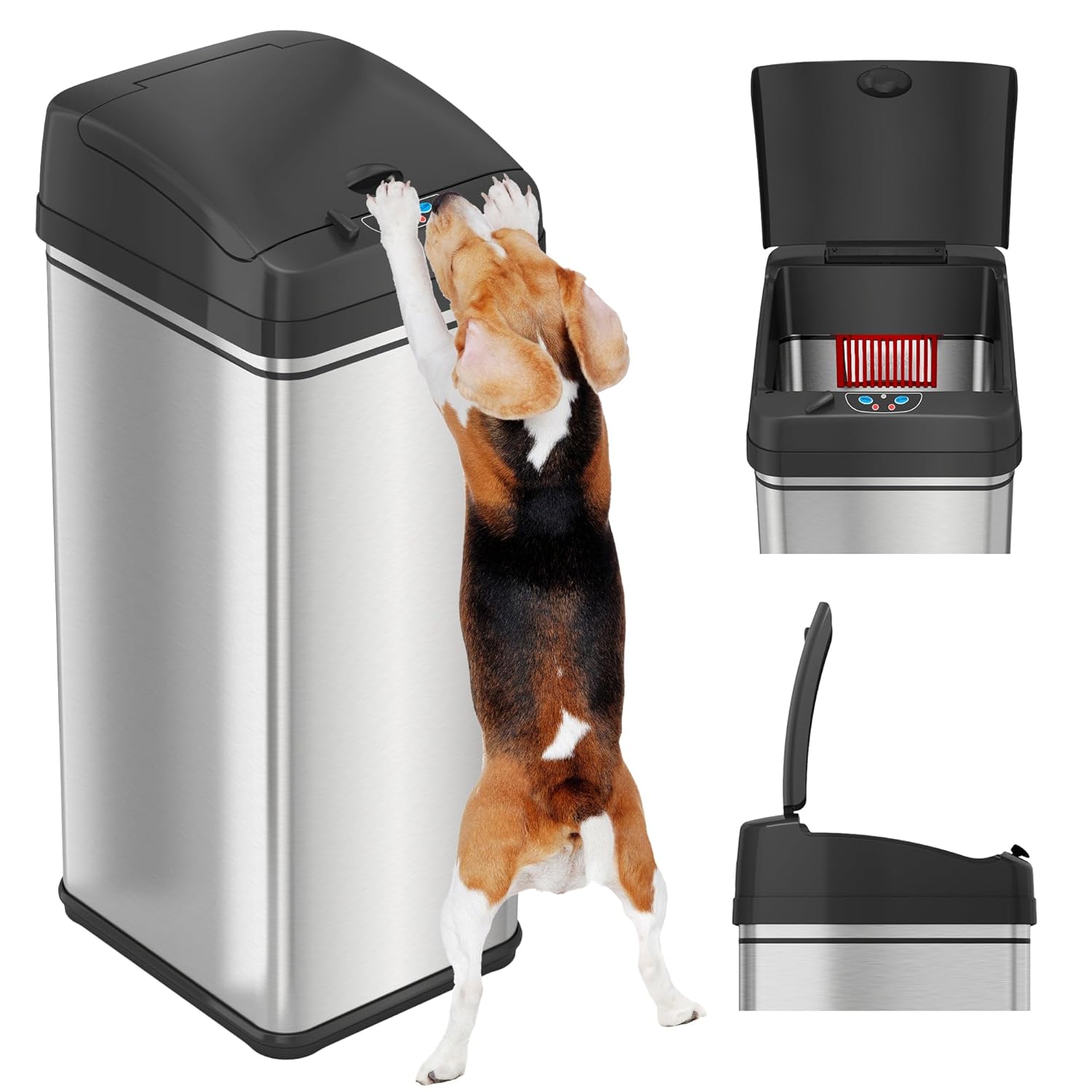 iTouchless 13 Gallon Sensor Trash Can 2.0 – Touchless Lid, Dog-Proof Lock, Odor Filter, Stainless Steel, Battery or Plug-in, for Kitchen, Home, or Office