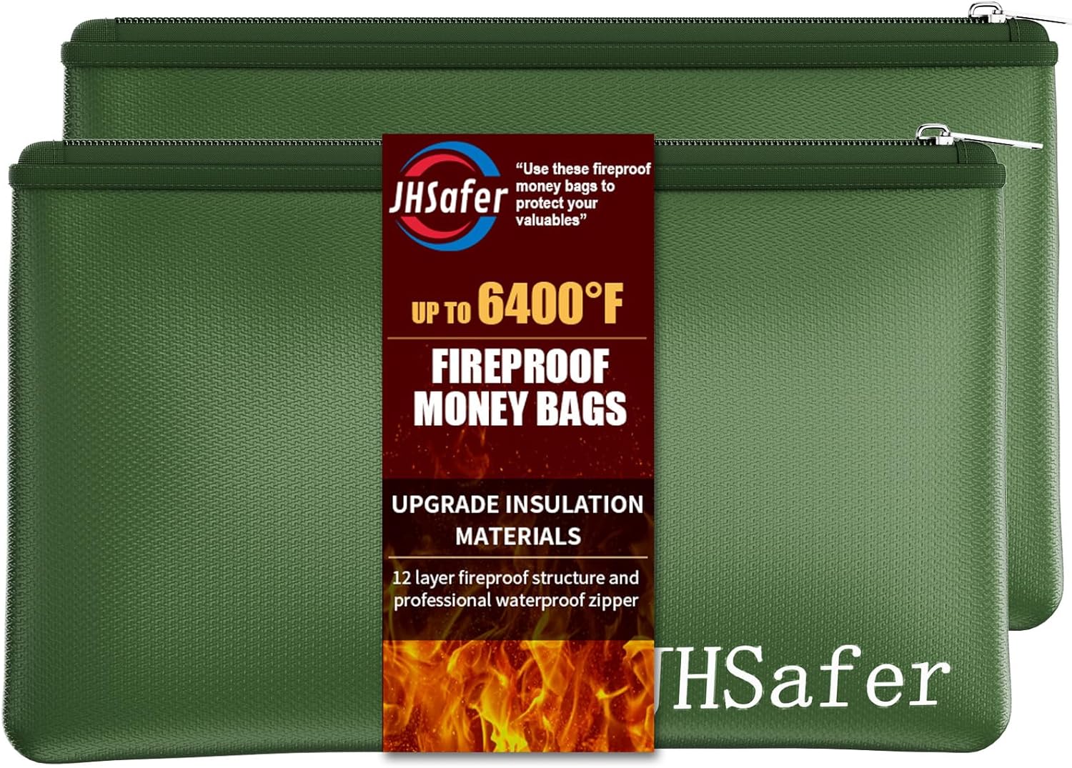 6400℉ Fireproof and Waterproof Money Bags 2pcs with Zipper,11''x6.3'' Fireproof Cash Bag with Zipper,Fireproof Wallet Envelope Safe Pouch Fireproof Bags for Cash Passports Keys Jewellery (Green)