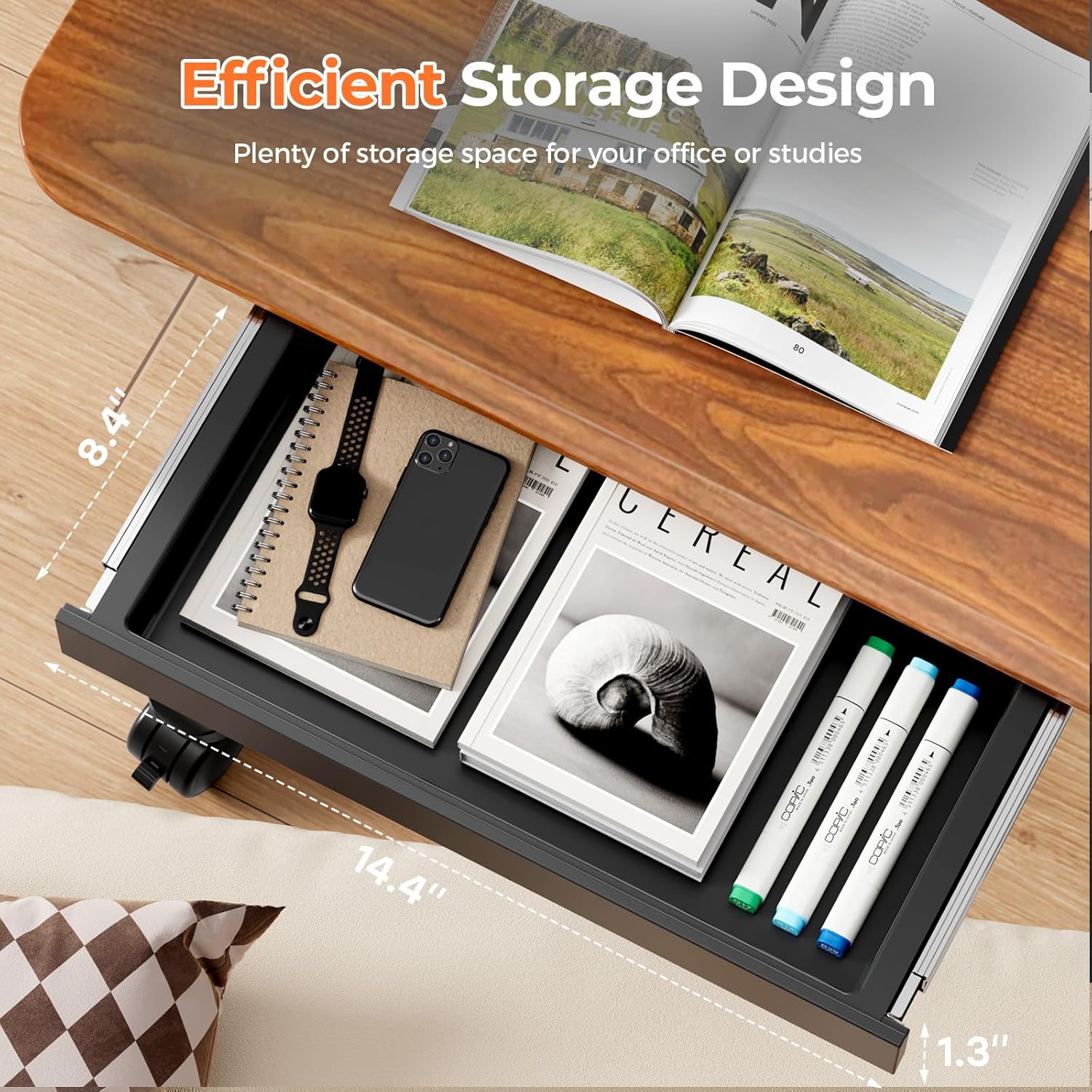 - Multipurpose Mobile Laptop Desk: The desktop measures 27.6"×19.7", providing enough space for laptop and other essentials without feeling too bulky. Equipped with cup holder and dedicated slots, it's a good way to contain your drink and office supplies