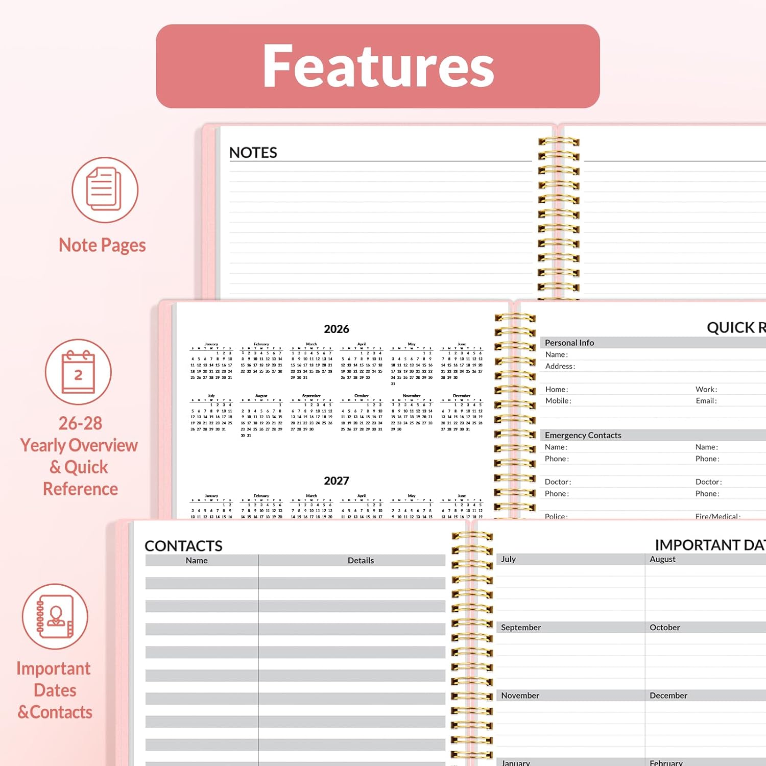 - Additional Features - The weekly planner includes 2026-2028 calendars, year schedule for full year 2026, holiday lists, contact pages, notes pages, important dates, and US time zone map. Rainbow monthly tabs simplify navigation and add a stylish, playful element to the planner's aesthetic.