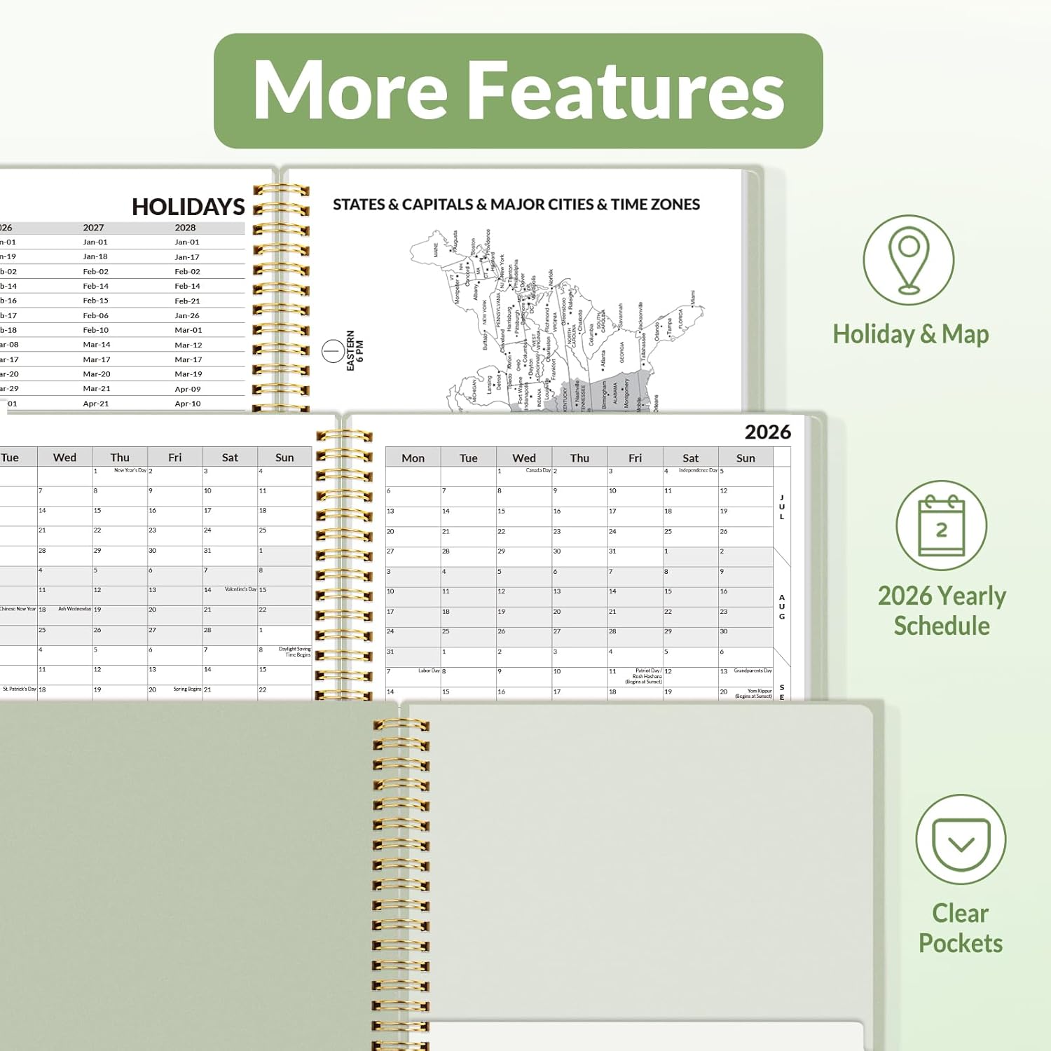 - Additional Features - The weekly planner includes 2026-2028 calendars, year schedule for full year 2026, holiday lists, contact pages, notes pages, important dates, and US time zone map. Rainbow monthly tabs simplify navigation and add a stylish, playful element to the planner's aesthetic.